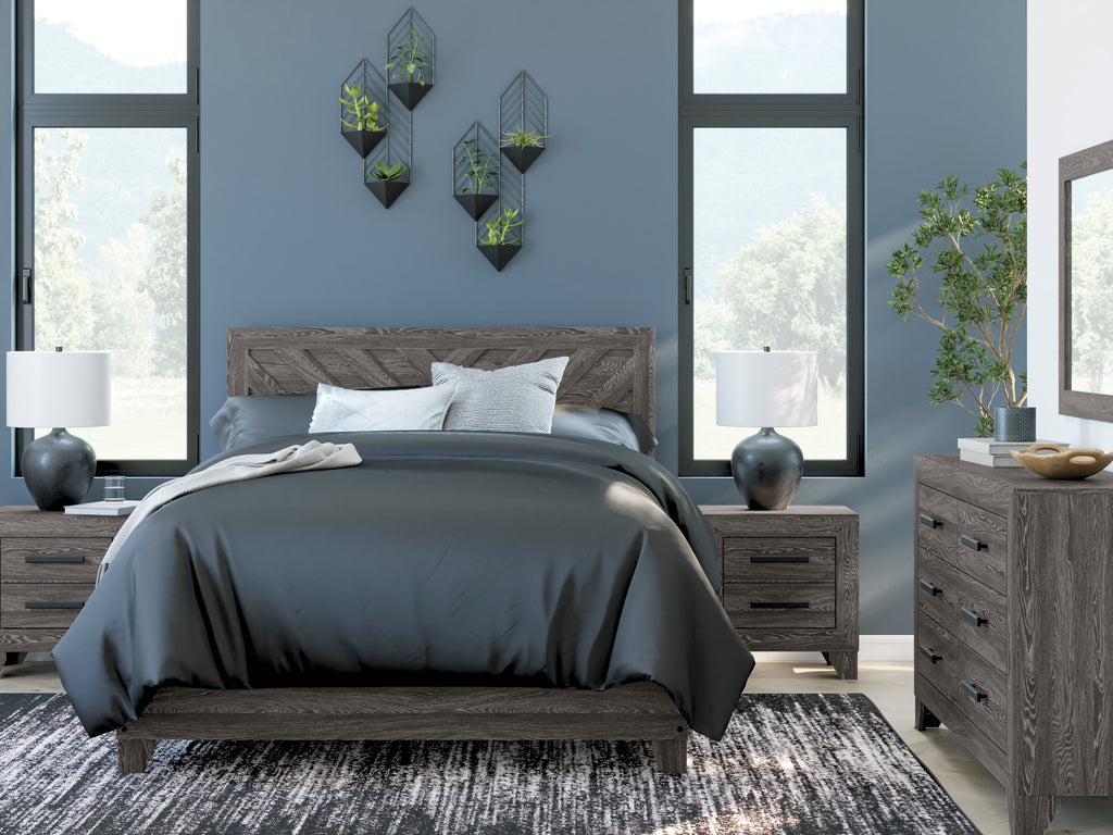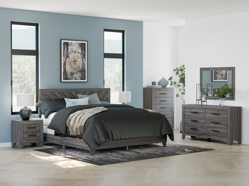 Create your ideal retreat with this Queen bedroom set. Featuring a captivating chevron design on the headboard, its charming rustic aesthetic and inviting warm gray finish will transform your space into a cozy sanctuary. With this stunning bed as the backdrop, you can unwind and recharge in style in your dream bedroom.