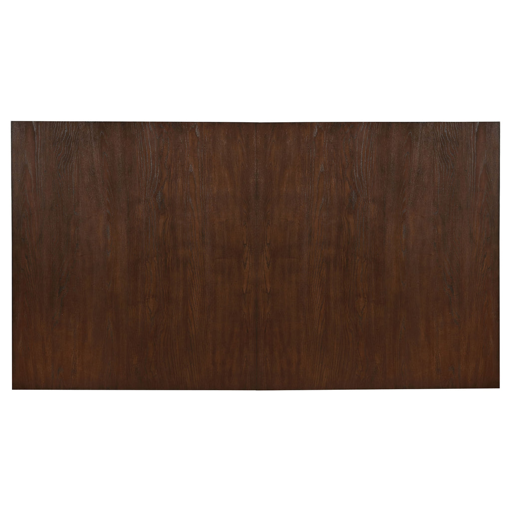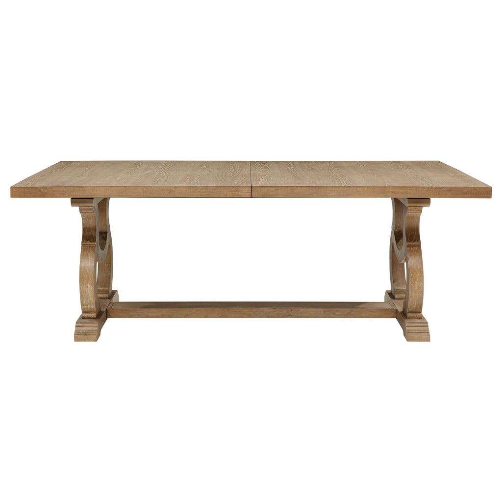 Invite warmth and timeless charm into your dining room with this elegant dining table. Designed for both casual gatherings and formal dinners, its rectangular silhouette extends easily to seat six to eight guests. The beautifully sculpted double pedestal base lends a graceful touch, while the barley brown finish highlights the natural wood grain. Crafted from solid rubberwood, engineered wood, and ash veneer, this table offers enduring strength and refined transitional appeal for everyday enjoyment. Key Features: • Dining table features rectangular design with warm barley brown wood tone • Finished in a smooth barley brown tone highlighting visible wood grain • Elegant trestle base with sculpted double pedestal design adds sophistication • Removable 20-inch extension leaf allows seating for up to eight guests comfortably • Crafted from solid rubberwood, engineered wood, and ash veneer for strength • Ideal centerpiece for transitional dining spaces and family gatherings