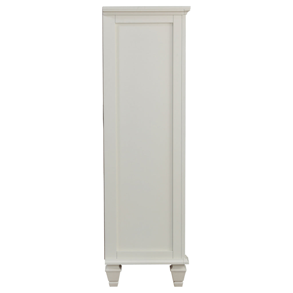 Add refined storage to your bedroom with this versatile door chest, offering both drawers and shelving to organize your essentials. With six spacious drawers and a cabinet door that opens to reveal an additional two drawers with shelving, this chest provides the perfect combination of concealed and open storage. The felt-lined top drawer is ideal for protecting delicate items, while the brushed nickel hardware adds a touch of modern elegance. Built from solid hardwood and engineered wood, this chest is finished in a neutral color, making it both durable and timeless in design. Whether you need extra space for clothing, linens, or other bedroom items, this door chest blends practicality with classic charm. Key Features: • Door chest featuring six drawers and a cabinet door with shelving for versatile storage • Felt-lined top drawer offers protection for delicate items • Cabinet door opens to reveal additional drawers and shelving for organizing linens or accessories • Brushed nickel hardware adds a touch of modern elegance • Soft cream white finish complements both traditional and transitional bedroom styles
