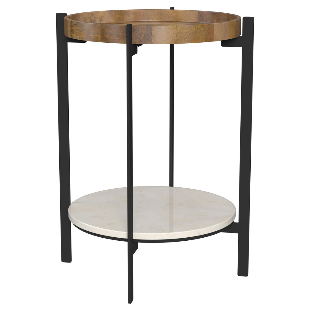 Complete your living space with this chic side table, blending organic materials with sleek modern design. The beautiful round mango wood top showcases unique grain patterns, while a white marble shelf below adds a touch of luxury. Supported by slender black iron legs, the end table offers sturdy support without overwhelming your space. Whether used as an accent or a functional piece, this versatile side table seamlessly blends style and practicality. Elevate the aesthetics of your home with this refined yet natural addition. Key Features: • Round end table crafted from mango wood, marble, and iron • Recessed solid wood top highlights natural grain variations • White marble shelf adds luxury and extra display or storage space • Slender black iron legs provide sturdy support with a minimalist look • Perfect blend of organic charm and modern style for a versatile accent piece