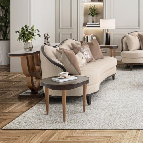 AICO Furniture Camellia Field Console Table in Warm Pecan 9090223-400. The Camellia Field Console Table exudes bold artistry and refined craftsmanship. Its mahogany veneer top, finished in warm pecan, is complemented by a sculptural base in antique gold, reminiscent of cascading petals. Perfect for an entryway or living space, this table blends practical function with eye-catching design.