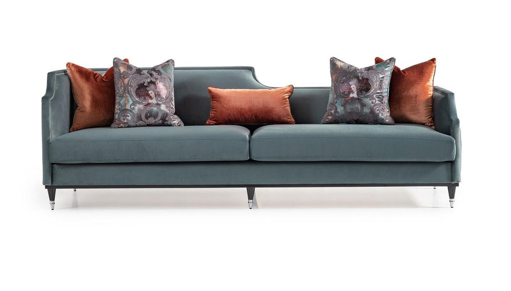 AICO La Francaise Mansion Sofa in Azure/Black LFR-FRSE816-AZR-805. The crown jewel of your living space, the La Francaise azure sofa. This opulent centerpiece exudes timeless elegance with its plush, azure blue velvet upholstery, and sinuous curves. Enhancing its regal charm, the sofa features sunset velvet decorative pillows that offer a captivating contrast, and two Marie Antoinette printed velvet accent pillows that pay homage to French royalty. Lounge in refined luxury on this exquisite sofa, where comfort and sophistication meet in perfect harmony.