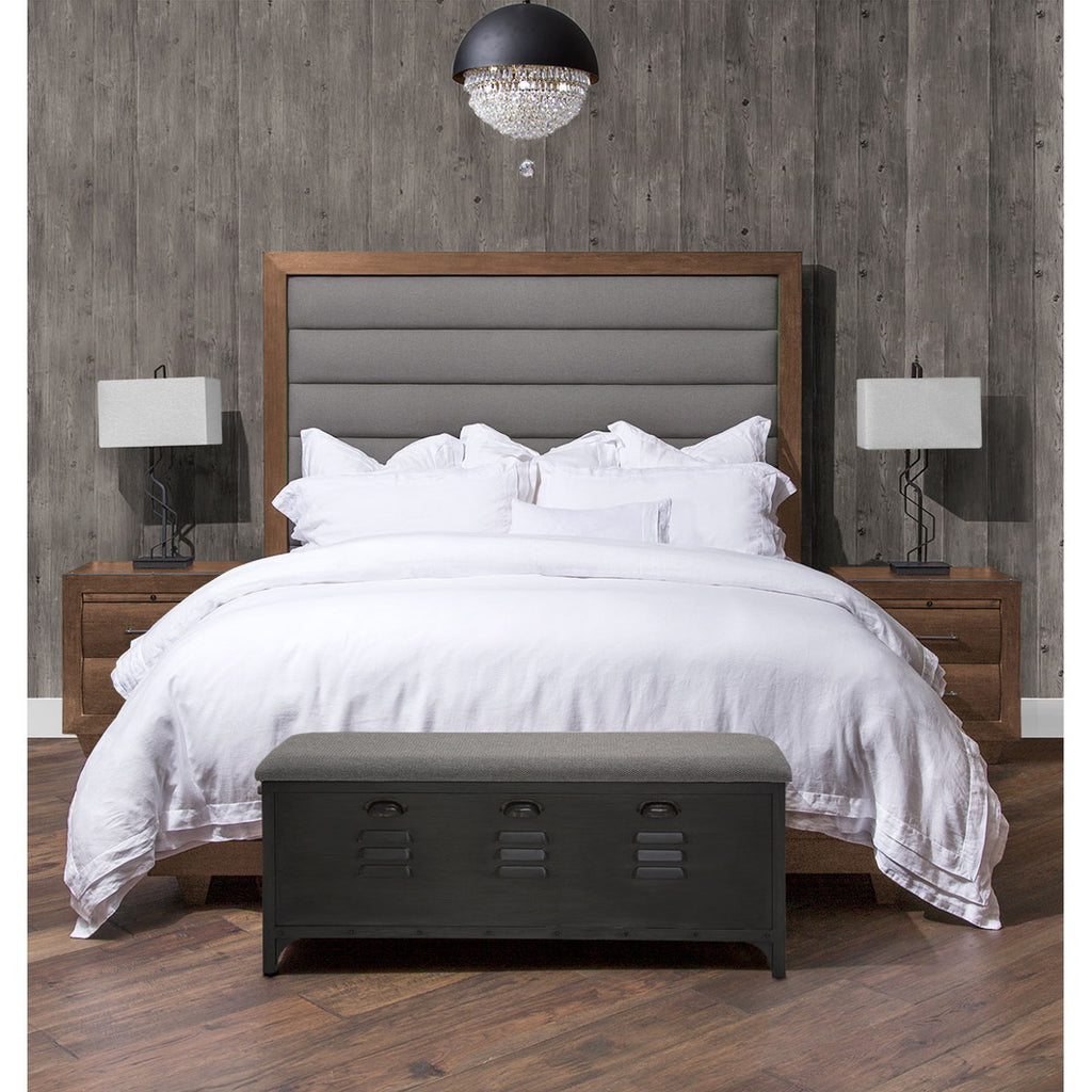 - Headboard is upholstered with gray horizontal panels