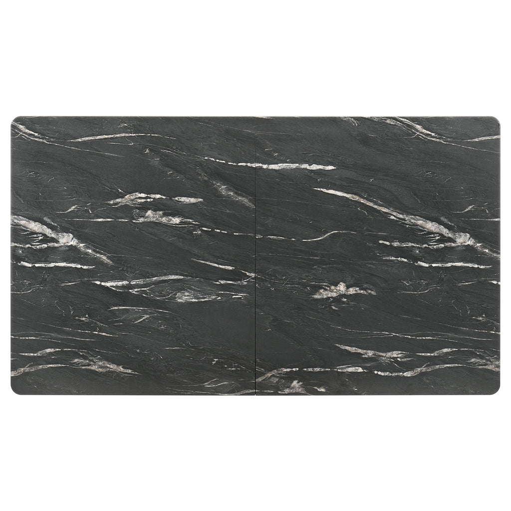 The luxurious look of faux marble creates a glam sensibility for a modern dining table. The black marble look of the tabletop complements a sleek base with fin-style legs and a recessed apron. The table includes a self-storing leaf for easy expansion to accommodate guests or the family. Its black base finish is crisp and classic, offering timeless elegance that never goes out of style. It's the perfect way to bring fresh, modern energy to your dining room.