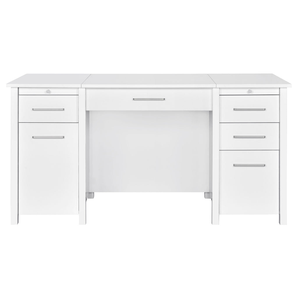 Create the perfect ergonomic home office setup with this contemporary lift top office desk. A smooth surface all around, this contemporary desk features clean lines and plenty of space for work or study. Spacious drawers help organize office files and essentials, each one fastened with a sleek pull in a shiny brushed zinc finish. Need extra writing space or a place to keep coffee nearby? This clever desk features two pull-out trays, one on each side. Extra touches like smooth ball bearing glides and soft-close glides offer modern upgrades. Key Features: • Clean lines create simple silhouettes for this contemporary lift top office desk • Features two pull-out trays with ball bearing glides for extra writing area on each side • Four different size drawers with soft-close glides provide plenty of storage • Handsome brushed zinc pull handles and knobs • Constructed with melamine paper, particle board, and MDF