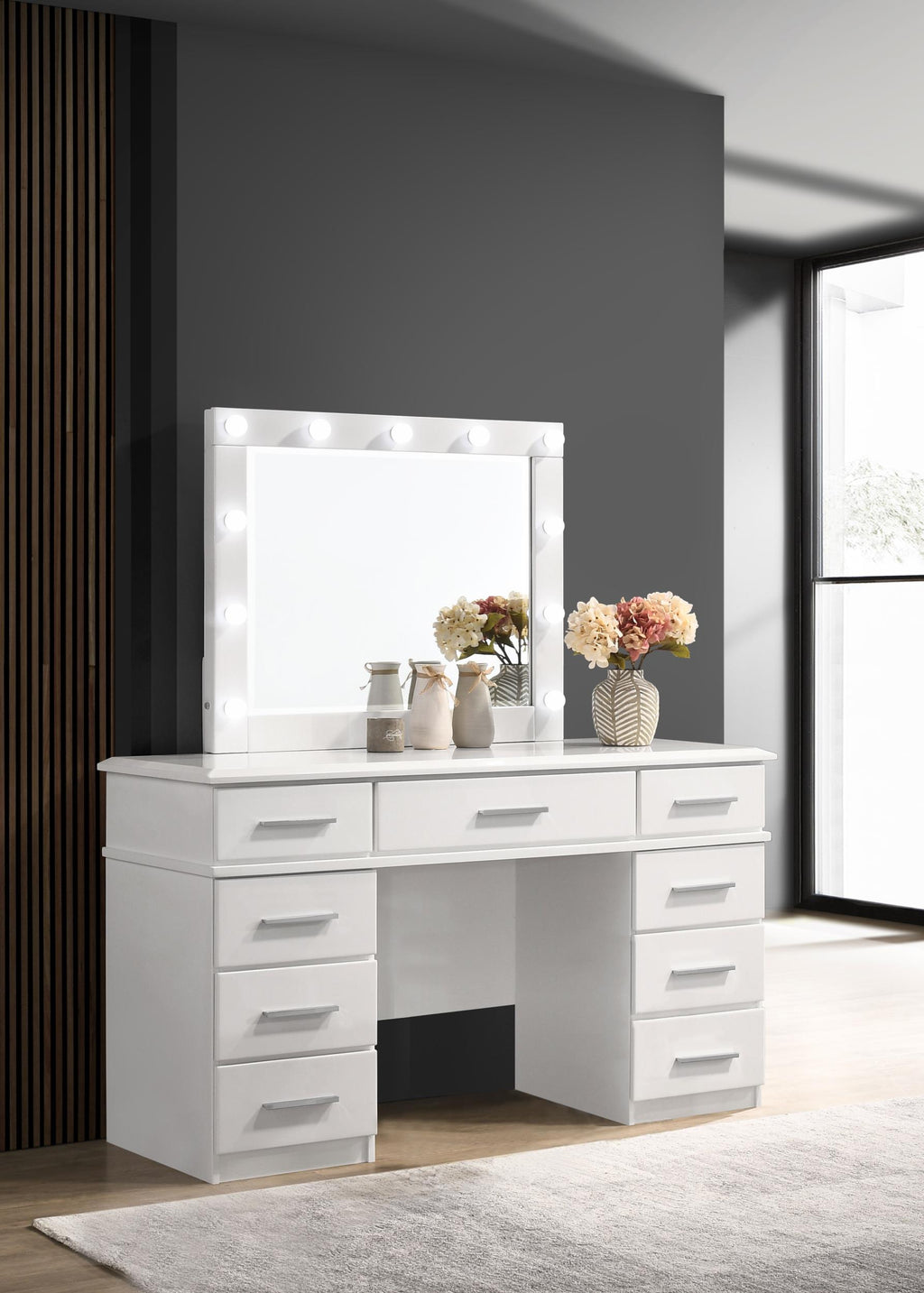 Covered in a high gloss white finish for an all-around sleek look, this contemporary vanity desk and matching mirror are perfect for dressing areas and bedrooms. Store cosmetics, perfume bottles and more within the multiple drawers to keep your vanity neat and tidy. Felt-lined top drawers invite you to also keep delicate items like jewelry, silk scarves and accessories. Situated on the top of the vanity dresser is a Hollywood style mirror, surrounded by 11 bright white LED lights that offer an even glow. Sleek chrome metal pulls adorn each of the drawer fronts, lending a modern flair.