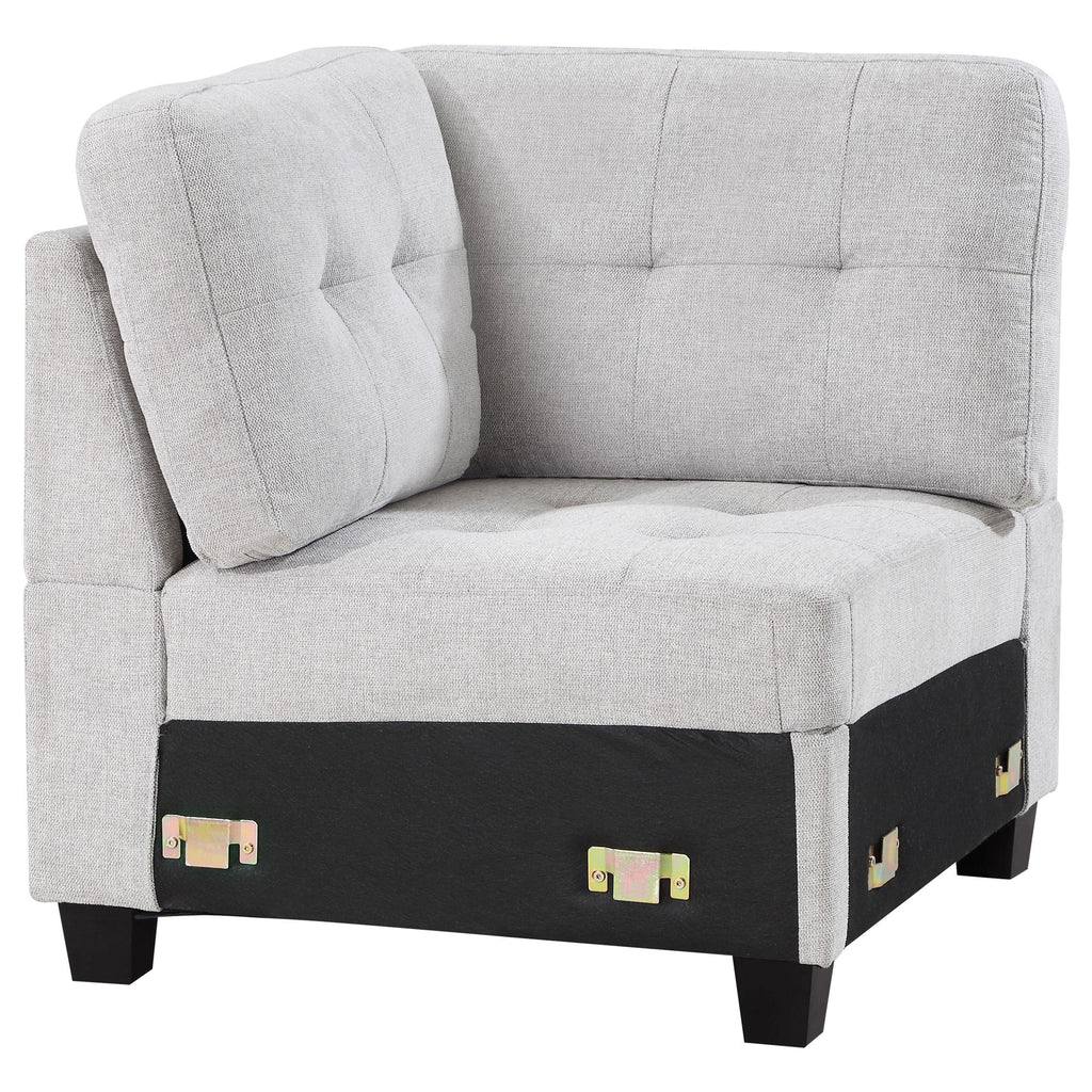 Customize a sectional that suits your space with a modern armless corner chair. In soft beige upholstery, it's the perfect centerpiece for your Georgina collection sectional sofa, creating a turn just where you need it to suit your living room. The corner features tufted cushions, one seat and two back, and sinuous spring decking under the seat, offering impressive comfort and support. Legs are a black finish tapered block style, complementing surrounding decor while offering stability and support. This sectional piece is constructed with Asian hardwoods and plywood for optimal strength and durability.