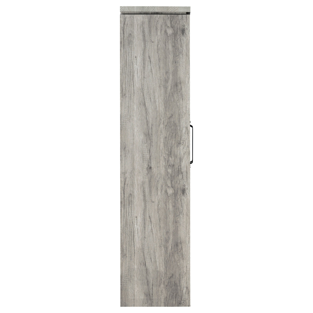 This tall curio cabinet makes for an impressive addition to a well-appointed home. The charming cabinet has classic sense of style and design. Two glass doors with contrasting dark hardware give the curio a distinguished appearance. The doors provide easy access to eight compartmentalized shelves offering abundant storage space. Finished in grey driftwood for a stylish look appropriate for any living room or den. Key Features: • Tall accent cabinet with a beachy grey driftwood finish • Two glass doors reveal eight adjustable interior compartments • Black hardware adds contrast and industrial-inspired detailing • Ideal for storage or display in coastal or casual interiors • Crafted from engineered wood, glass, and laminate veneer • Includes tip-over restraint for stability