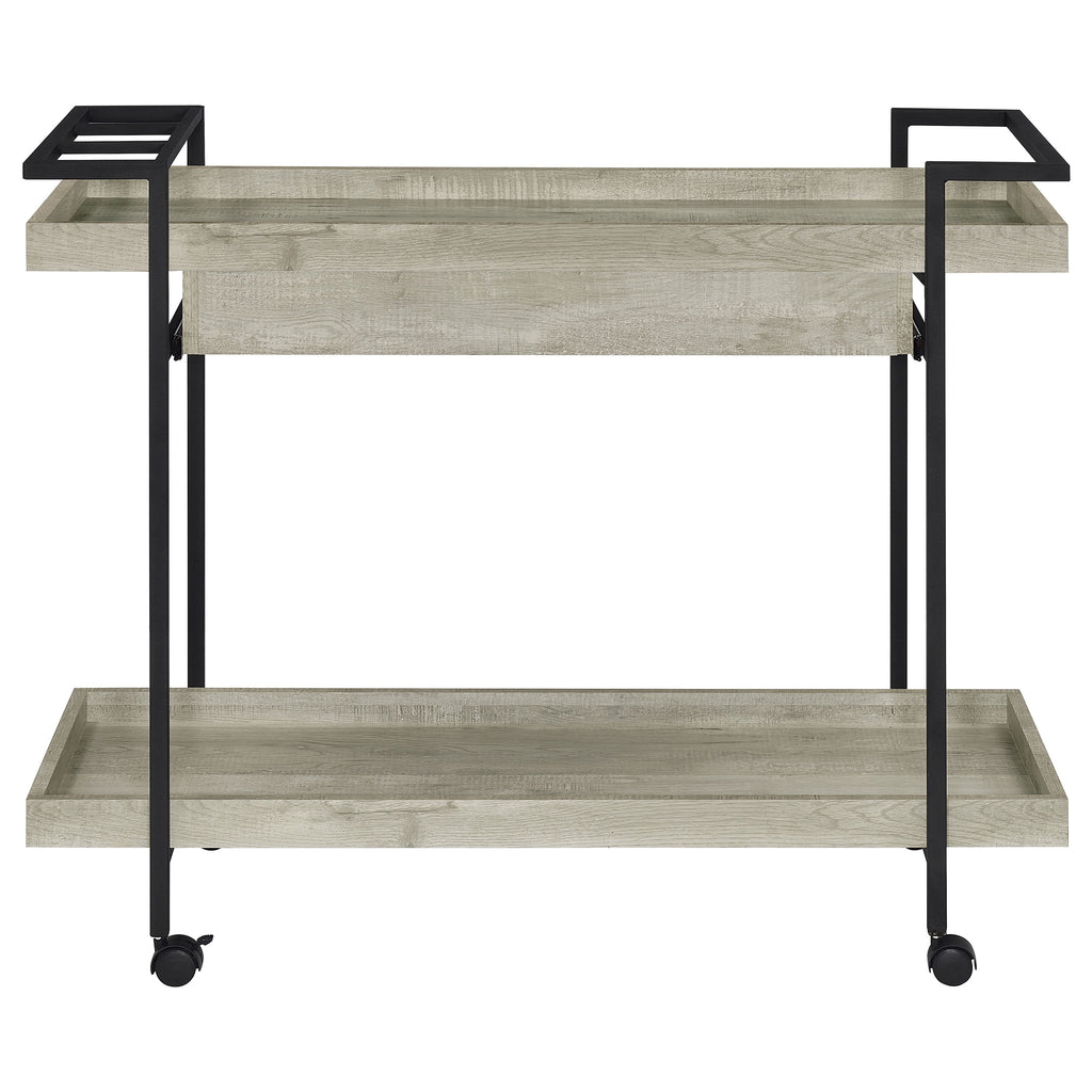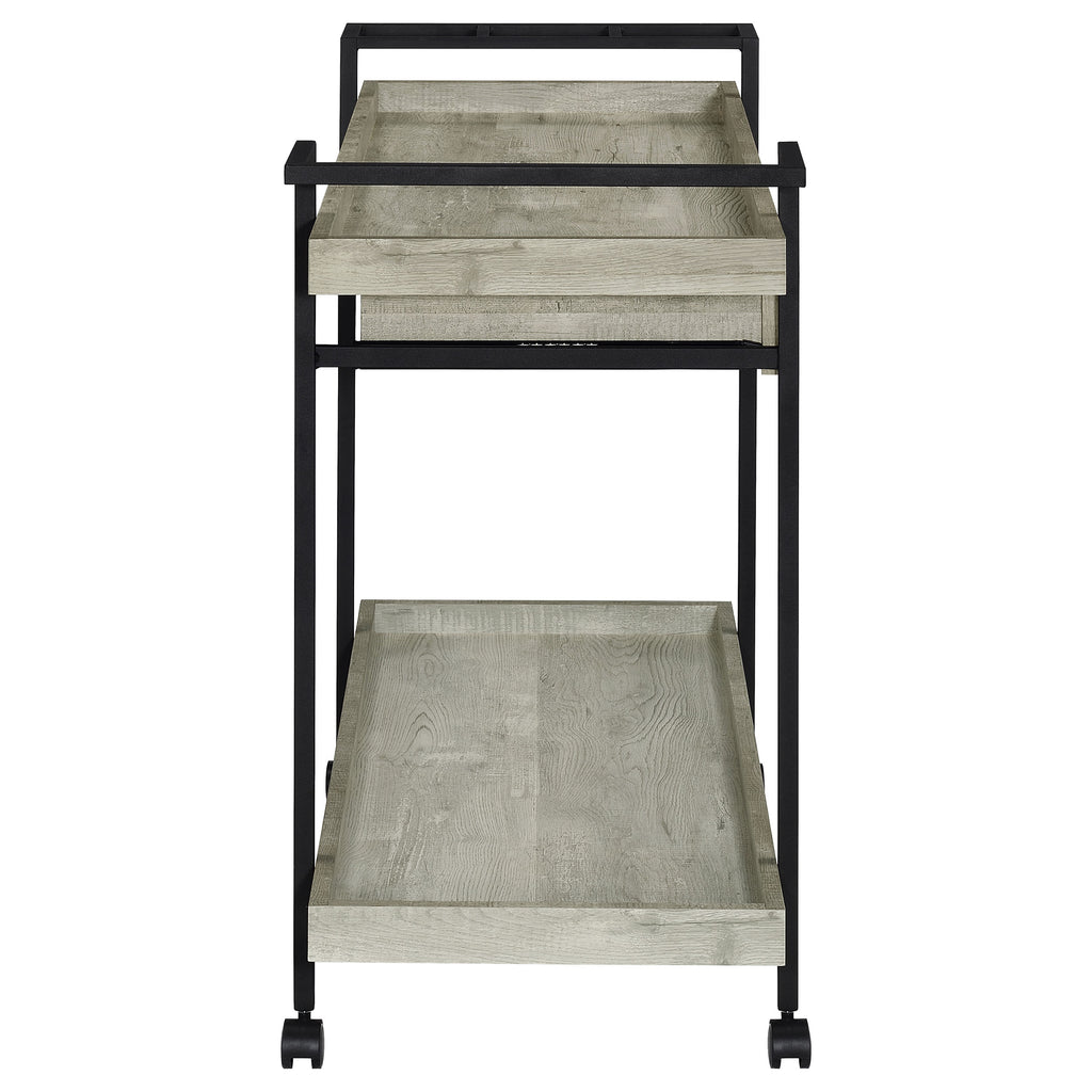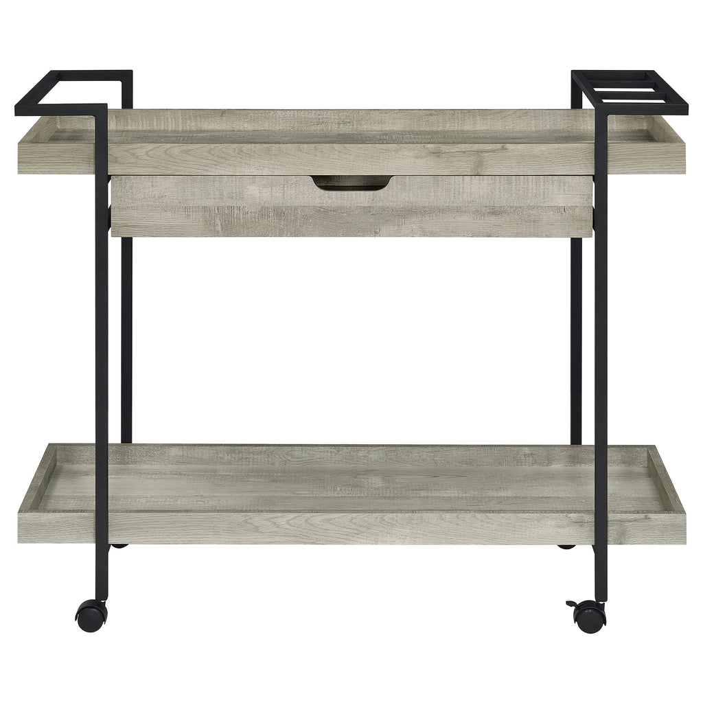Speakeasy charm meets modern farmhouse in a delightful mobile bar cart. Whether you're mixing cocktails or pouring a favorite vintage, the cart offers plenty of space for both storage and prep with a tray-style top and shelf, plus a drawer ideal for accessories. A black finish metal frame includes handles, with three open squares on one side that help to keep bottles upright. A casual gray wood grain finish accents the look with farmhouse inspirations, perfect for relaxed living and dining rooms. Ball bearing drawer glides and caster wheels complete the cart with smooth, seamless performance. Key Features: • Speakeasy charm meets modern farmhouse in a delightful mobile bar cart with black finish metal frame, handles, and three open squares for bottles • Tray-style top and shelf plus drawer for accessories provide plenty of storage and prep space • Casual gray wood grain finish accents the look with farmhouse inspirations • Ball bearing drawer glides and caster wheels complete the cart with smooth, seamless performance • Ideal for relaxed living and dining rooms