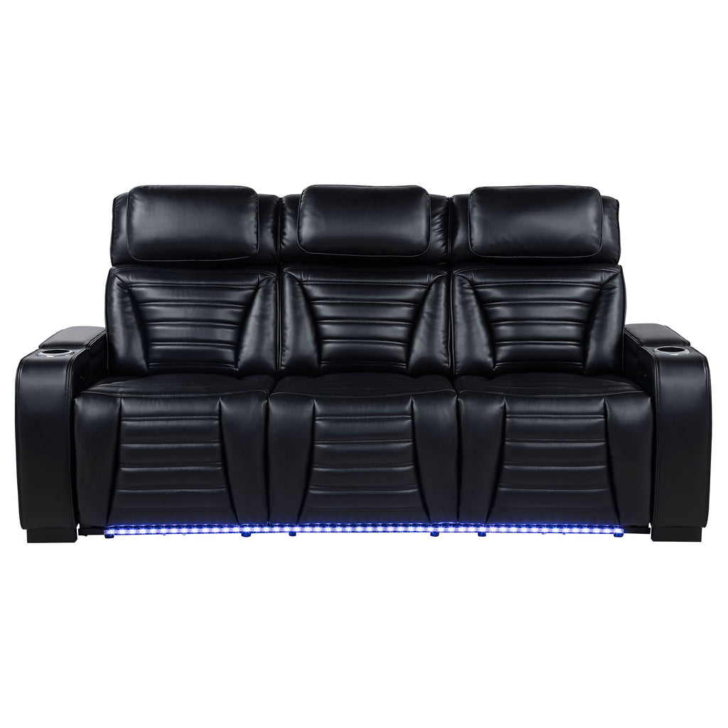 Bold and feature-rich, this dual power sofa delivers luxurious comfort with high-tech convenience. Equipped with power recline and power-adjustable headrests, it offers customizable relaxation at the touch of a button. A center drop-down console includes dual AC outlets, dual USB ports, and reading lights hidden inside the flip-up headrest. Cup holders, LED under glow, and dual USB ports in the side control panels complete this smart seating solution. Key Features: • Dual power sofa in black faux leather includes power recline and power headrest adjustment • Drop-down center console features dual AC outlets, USB-A and USB-C ports, and lighting • Flip-up center headrest reveals dual reading lights ideal for evening or ambient use • Integrated control panels on both sides offer USB-A, USB-C, and a convenient home button • Each armrest includes a built-in cup holder for added comfort and functionality • Blue LED under glow lighting creates a dramatic, modern lounge effect across the base