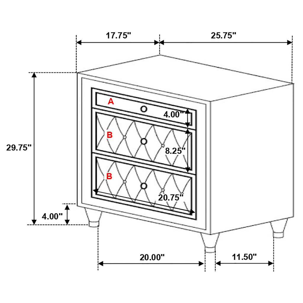 A traditional and modern bedroom set meets all expectations for an incredible impact in your sleeping space. Smooth and soft upholstered enhances each piece in this set. Coming in a camel and ivory color, this set is inspired by French Provincial decor. Crystal-like accents make their presence known within the button tufting. Gorgeous nailhead trim adds the finishing touch on this upholstered bedroom set.