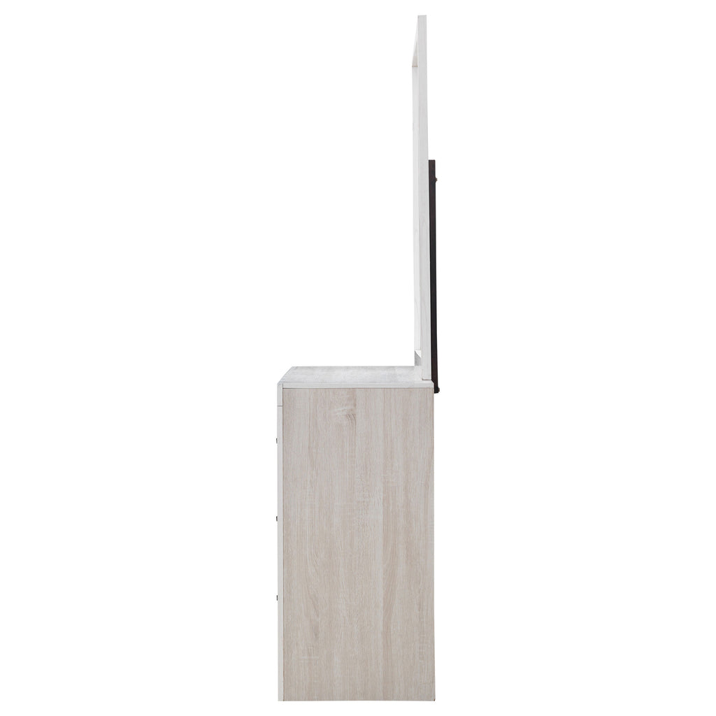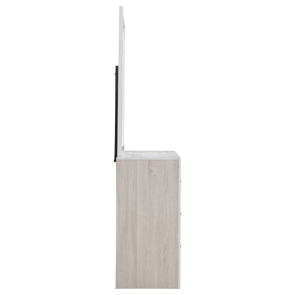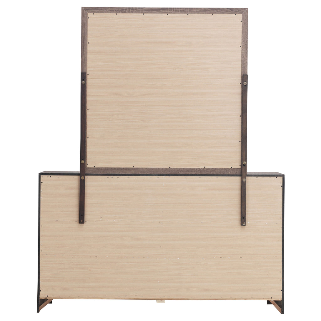 This dresser and mirror set offers a blend of modern design and practical storage. The six-drawer dresser provides ample space for clothing and essentials, while the matching mirror enhances depth and brightness in any room. Crafted from engineered wood with a durable laminate veneer, this set is built for long-term use. Matte dark bronze handles contrast against the sleek frame, adding a refined touch to its contemporary aesthetic. Key Features: • Dresser and mirror set with a sleek, modern silhouette and clean lines • Barrel oak finish enhances the warm, natural wood grain aesthetic • Six spacious drawers provide ample storage for clothing and essentials • Sturdy engineered wood construction ensures lasting durability • Matte dark bronze handles add a stylish contrast to the frame • Durable laminate veneer resists scratches, stains, and everyday wear