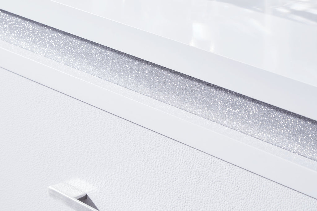 This dresser with mirror is a showstopper, bringing a touch of modern glamour to your sanctuary. A sleek white finish and inset glitter accents create a luxurious feel, while six spacious drawers provide ample storage for your wardrobe. The mirror’s built-in LED lighting adds a soft glow, making it even easier to get ready in the morning or wind down at night. It’s a simply stunning way to achieve the bedroom of your dreams.