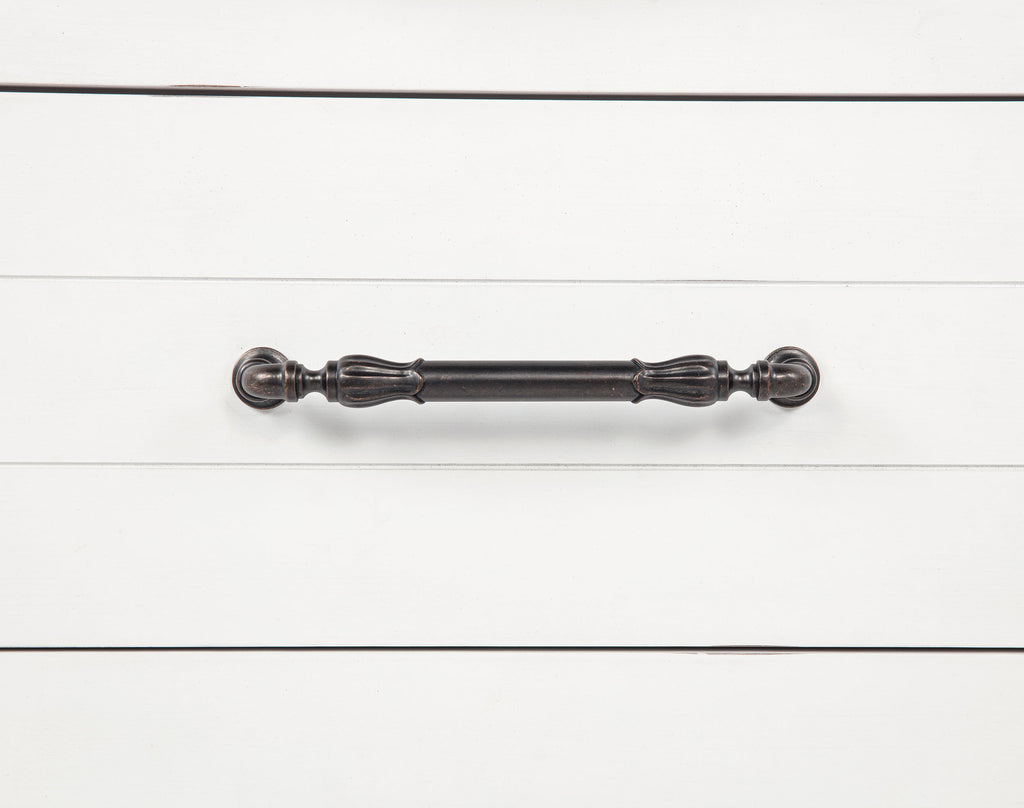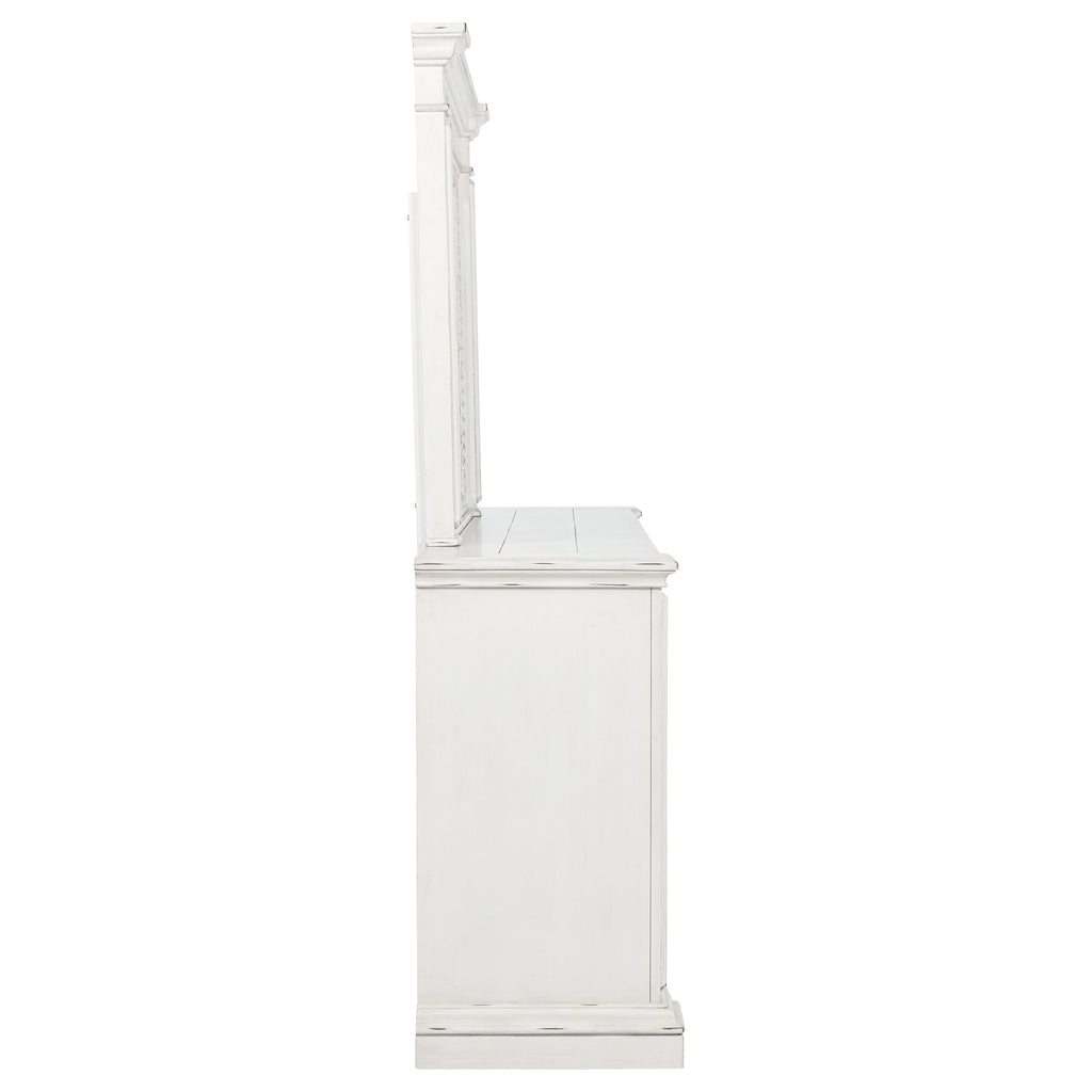 Rooted in traditional elegance, this dresser and mirror set brings vintage charm and refined detail to the bedroom. Framed with ornate carvings and softened by a distressed white finish, the six-drawer dresser offers ample storage with thoughtful touches—including a hidden jewelry tray in the bottom drawer. Antique bronze pulls and crown molding complete the look. Crafted from poplar and engineered wood, it’s designed with both beauty and function in mind. Key Features: • Six-drawer dresser and mirror set with ornate trim and traditional crown molding • Vintage white finish offers aged character with soft, antique-inspired appeal • Antique bronze drawer pulls provide contrast and decorative visual weight • Bottom drawer includes hidden jewelry tray for organized, concealed storage • Felt-lined top drawers and smooth glides add elevated function to daily use • Crafted from poplar, engineered wood, and mirrored glass for enduring charm