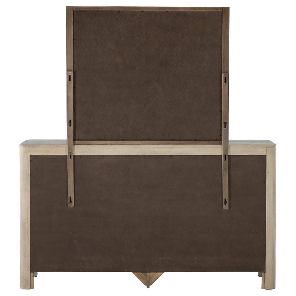 With its broad frame and softened curves, this dresser and mirror set radiates quiet confidence and poise. Sculpted edges flow gracefully around nine generous drawers, while the tall mirror reflects light and space with understated beauty. A hidden jewelry tray in the top drawer adds a thoughtful touch of luxury. Designed to bring harmony and order, this piece is both a centerpiece and a sanctuary for daily rituals. Key Features: • Nine-drawer dresser with sculpted edges and matching mirror for elegant bedroom storage • Weathered mango finish highlights the wood grain with a warm, organic appearance • Felt-lined top drawers offer soft storage for delicate items and daily essentials • Hidden jewelry tray in upper right drawer provides discreet organization • Heavy duty drawer glides ensure smooth, dependable movement and access • Crafted from mahogany, engineered wood, and mirror for beauty and durability