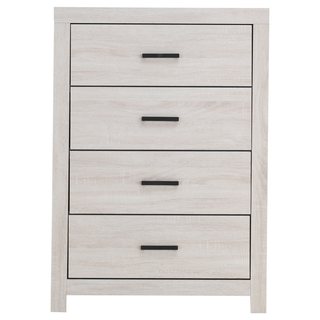 This four-drawer chest combines modern style with practical storage. Its clean-lined frame complements contemporary spaces, while four spacious drawers provide ample room for clothing, linens, and accessories. Crafted from engineered wood with a durable laminate veneer, it is built for everyday durability. Matte dark bronze handles enhance the refined look, making this chest a functional and stylish addition to any bedroom.