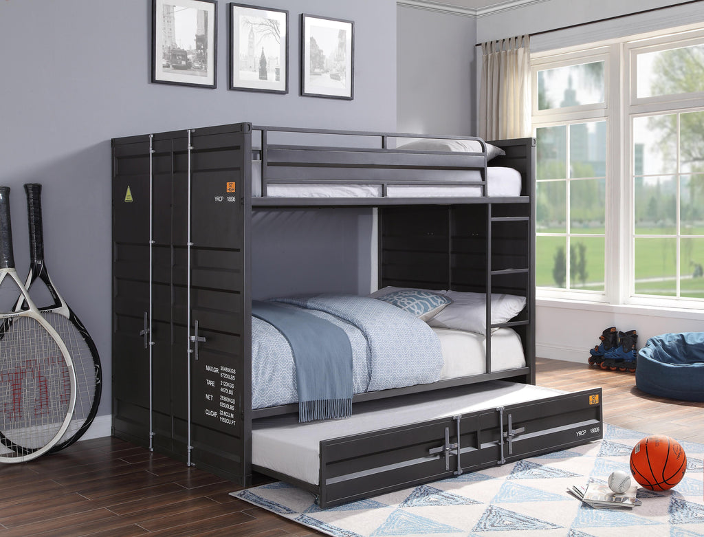 ACME Cargo Bunk Bed (Full/Full), Gunmetal (1Set/2Ctn), 78" x 56" x 65"H, 182Lbs. The Cargo bunk bed and trundle is the perfect addition to any child-s room. This contemporary container themed metal bunk bed is crafted with an industrial look that is an ideal addition to your bedroom. The bed is accented with recessed panel design and locks in an understated finish. This fashionable bed will accent your other bedroom furniture, transforming a room from ordinary into something playful and unique. Materials: Metal