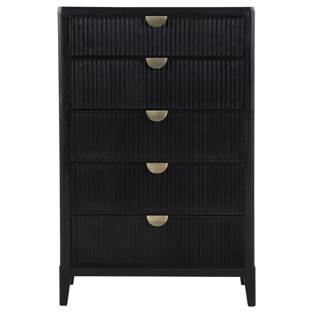 Add abundant clothing and accessory storage in a stylish bedroom with this modern five-drawer chest. Its compact profile fits virtually anywhere, while a chic look is created with fluted drawer fronts that add impressive dimensionality. A black finish imparts sophistication, while wire brushing creates a subtle sense of texture and depth. Each drawer front is adorned with a half-moon handle in a soft golden metallic finish that adds a perfect hint of warmth. The top drawer of the chest adds felt lining, perfect for protecting delicate items.