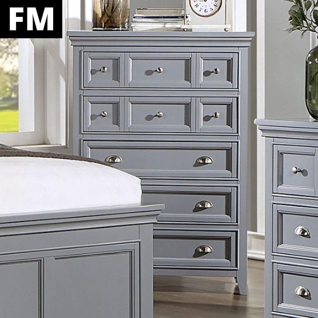 Take serenity home with this chest from the Castile collection. Topped with beautiful crown molding details, the gray finish and the nickel cup pulls complement each other well in tone and hue.