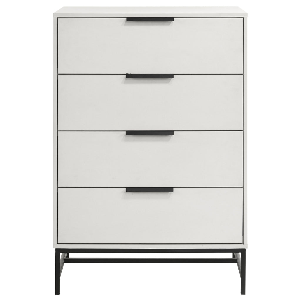 Create ample storage with the compact footprint of a modern four-drawer chest. Its roomy drawers are ideal for clothing, linens, and accessories, helping to keep your personal space tidy and organized. A white finish complements straight, clean lines, while black hardware adds contrast and depth. complementary metal base in black adds light, airy ambiance. Use the top for decor like photos, or add a jewelry box for a personal touch.
