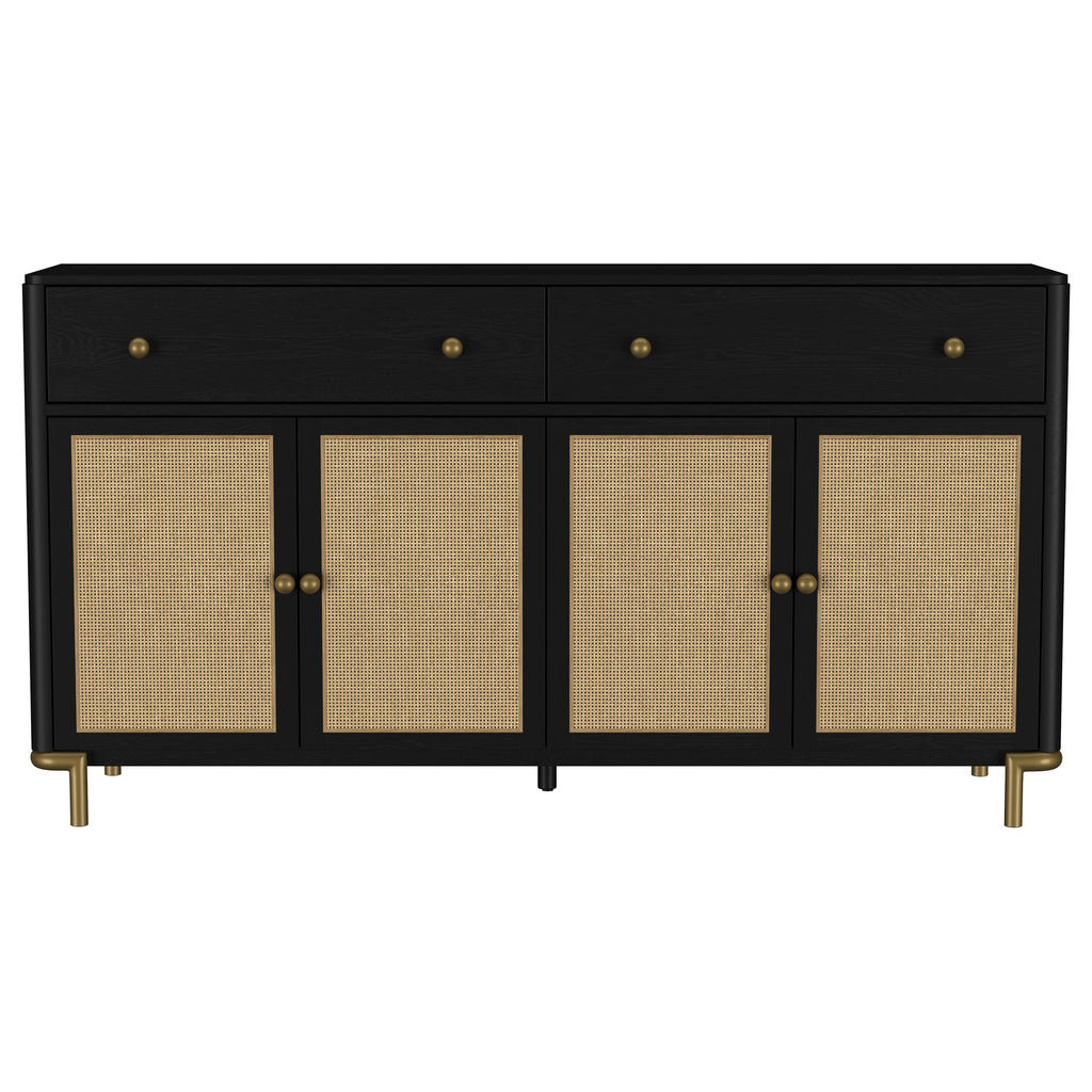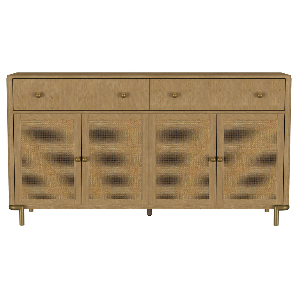 This 65-inch sideboard combines modern sophistication with organic charm and exceptional functionality. Featuring handcrafted woven cane door panels from Indonesia, it adds natural texture to any space. Constructed from solid Asian hardwood and white ash veneer, its refined craftsmanship is enhanced by a 17-step finishing process. Felt-lined drawers with English dovetail construction glide smoothly on 45mm metal ball-bearing tracks, while soft-close Euro-hinged doors and adjustable shelves offer practical storage. Antique brass knobs and legs complete the elegant design.