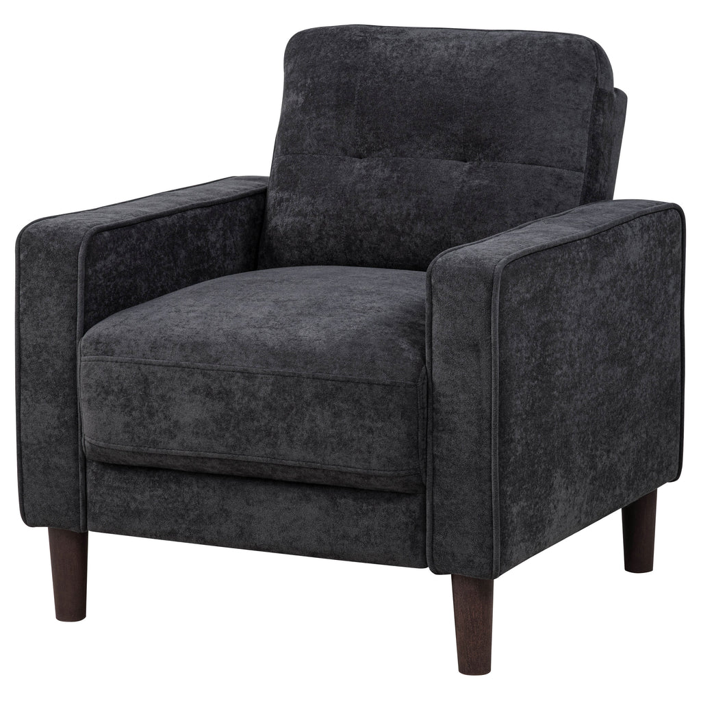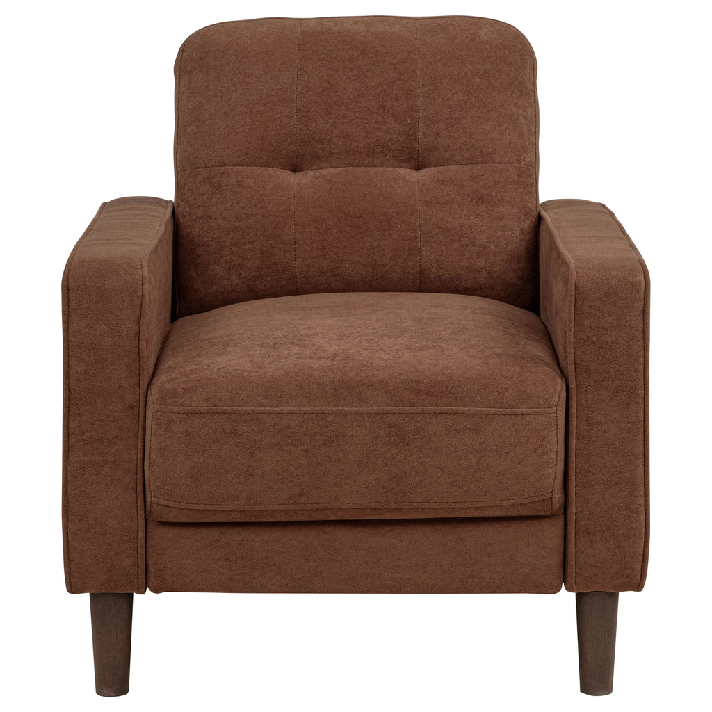 This modern accent chair brings cozy scale and crisp structure to any compact space. Wrapped in soft, textured upholstery, it features slim track arms with cord welt trim and a grid-tufted back for tailored charm. A pocket coil seat offers long-lasting comfort, while tapered round legs provide a stable, elevated base. Perfectly sized for apartments, bedrooms, or reading nooks, this chair delivers a refined yet inviting presence. Key Features: • Accent chair with slim track arms and tailored grid-tufted back cushion for refined comfort • Rust upholstery adds soft texture and a modern neutral tone for any small space • Cord welt trim outlines the frame and seat with crisp, polished detail • Pocket coil seat construction offers firm support and enduring comfort • Soft polyester fabric is smooth to the touch and easy to care for in daily use • Tapered round legs deliver lifted stability and a sleek, mid-century inspired look