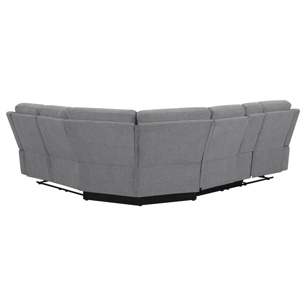 Wrapped in cool smoke color performance linen-like fabric, this modern three-piece motion sofa sectional creates a comfy venue for hosting large groups or intimate gatherings. Relax on a sofa offering manual reclining features and a wall-hugger design that saves space. Attractive horizontal channeling of soft smoke finish upholstery brings a dimensional look to this sofa, aligning with padded arms that embellish a luxurious feel. The stability of pocket coil springs in each chair space carve out extraordinary comfort. Outfitted with a lift-top console concealing storage space and removeable stainless cups in holders, it adds a go-to set of qualities perfect for today’s casual or semi-formal living spaces.