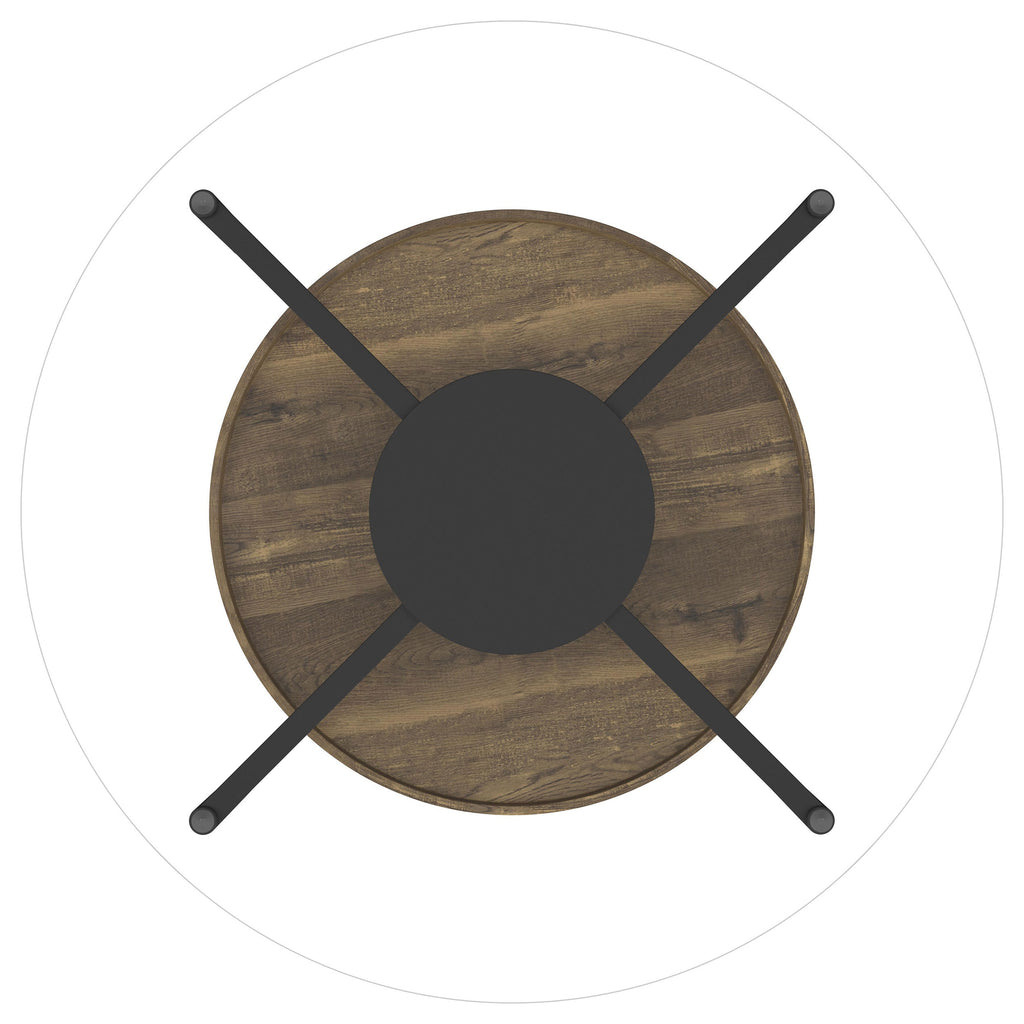 Center your living space with this inviting transitional coffee table that combines farmhouse charm with modern elegance. The X-cross frame is exposed beneath the round tempered glass top, adding dimension and visual interest. A black finish disc at the intersection of the frame offers an artistic touch, grounding the design. Below, the tray-style shelf features a warm brown wood grain finish with laminate veneer, providing both style and function with a subtle contrast to the glass and metal elements to this cocktail table.
