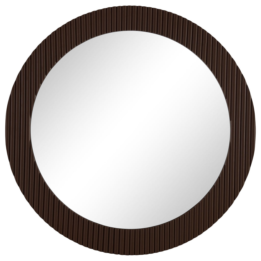 Offer artisan or industrial flair in any space with the textural flair of this round wall mirror. It's a modern design that features flat glass for easy reflectivity in any space. The round profile is accentuated with a MDF frame with fluting that creates a stylish textural effect. A rich brown finish plays up its casual character. Choose a spot over a tabletop or mantel to create contrast with its circular design.