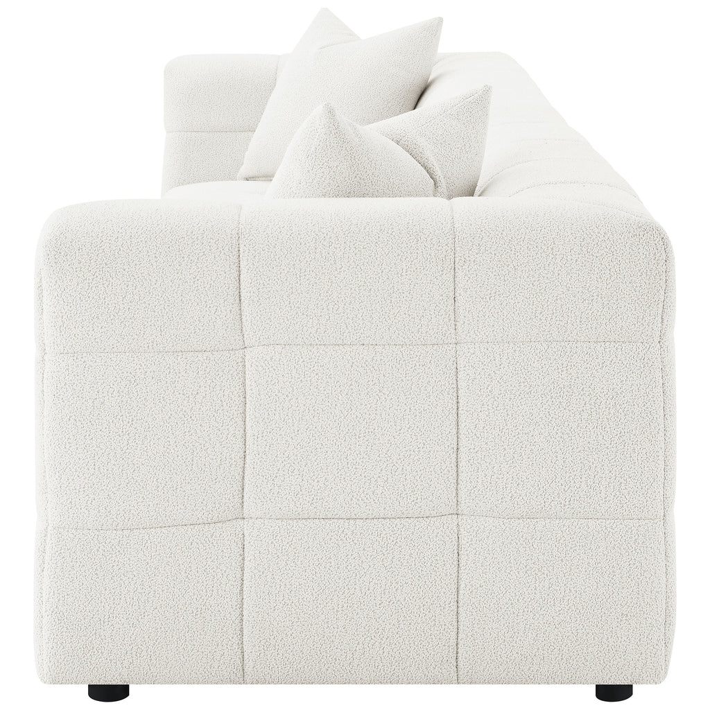 Introduce a touch of playful sophistication to your living space with this extra long 114-inch sofa. Designed for those who appreciate both style and comfort, this extra long sofa features fun geometric details, a detailed grid tufted design, and soft textured boucle upholstery. Wrapped in luxurious boucle fabric, the Sofa XL offers a plush and inviting seating experience, perfect for relaxing or entertaining. The included two pillows add an extra layer of comfort and style, making this sofa a standout piece in any room. Pair it perfectly with a reversible and functional ottoman to complete the ultimate lounging setup.