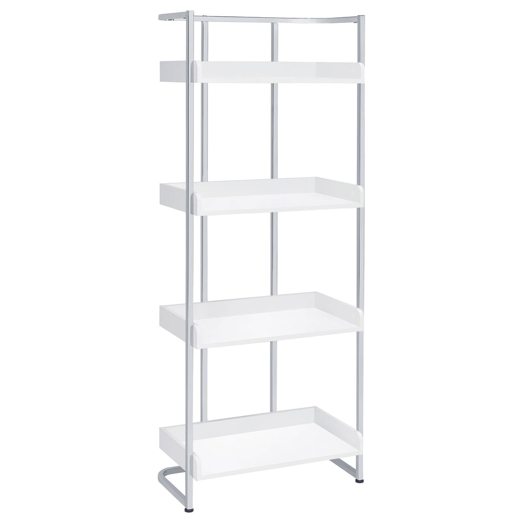 A steel bookcase is bound to steal your heart with its stylish appearance. Four roomy shelves allow for displaying your favorite novels. With its open back design, you'll have no trouble finding the ideal spot in your modern office. Its construction ensures a durable and long-lasting upgrade. This piece is supported on a rounded open base.