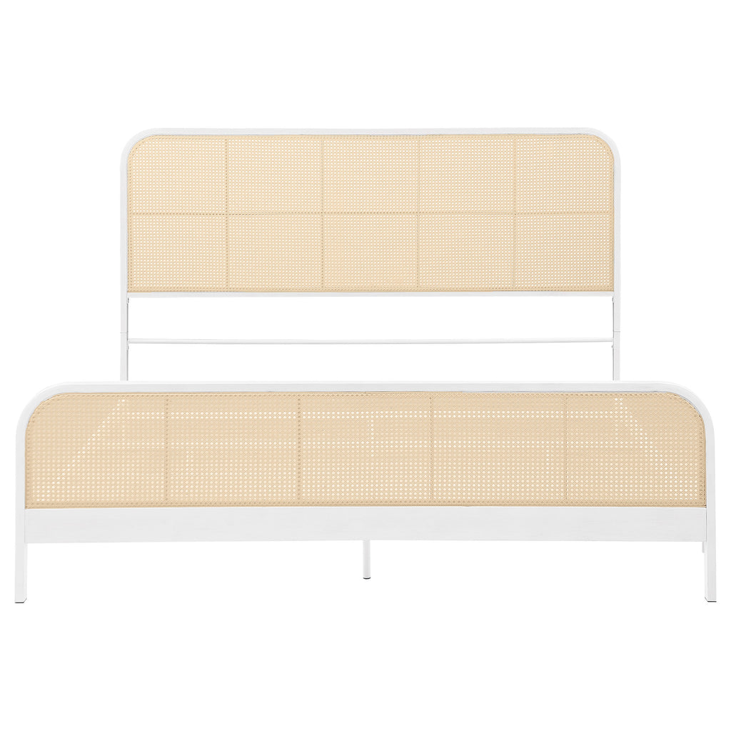 Introduce a touch of modern charm to your bedroom with this stylish metal bed. The bed features a powder coated metal frame with hand-brushed antiqued detailing. Rounded corners and a unique rattan-style woven design on the headboard and footboard. The sleek and sturdy construction ensures long-lasting durability, while the open, airy design adds a sense of space to your room. This bed is perfect for those who appreciate contemporary design with a hint of natural elegance.