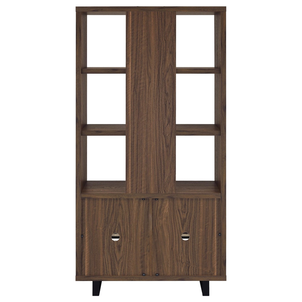 Create storage and add charm in one with a modern bookcase. It features a cabinet in the base, decorated with slatted doors that open to reveal shelving for easy storage. Upper shelves are open, with a center slat that creates dimension and offers structured support. The bookcase features a warm, rich walnut wood finish, easily lending in modern and mid-century inspired living spaces, bedrooms, and dens. The bookcase features a melamine finish that's durable and resistant to scratches and a tip-over restraint is included for added safety.