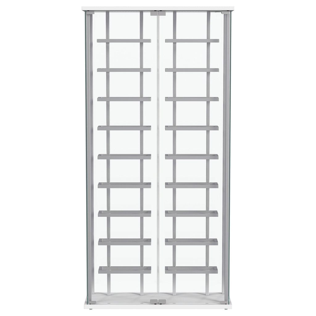 Put the spotlight - literally - on your favorite vintages with a modern bar cabinet. The glass cabinet is crystal clear with built-in LED lighting, offering bright, open flair in your dining room or home lounge. The cabinet features two glass doors with chrome hardware, offering a matching look to interior shelving. Shelves hold up to 18 of your favorite bottles of wine, showing them off to their best effect. The LED light is operated with a touch switch, making it simple and easy to highlight prized vintages.