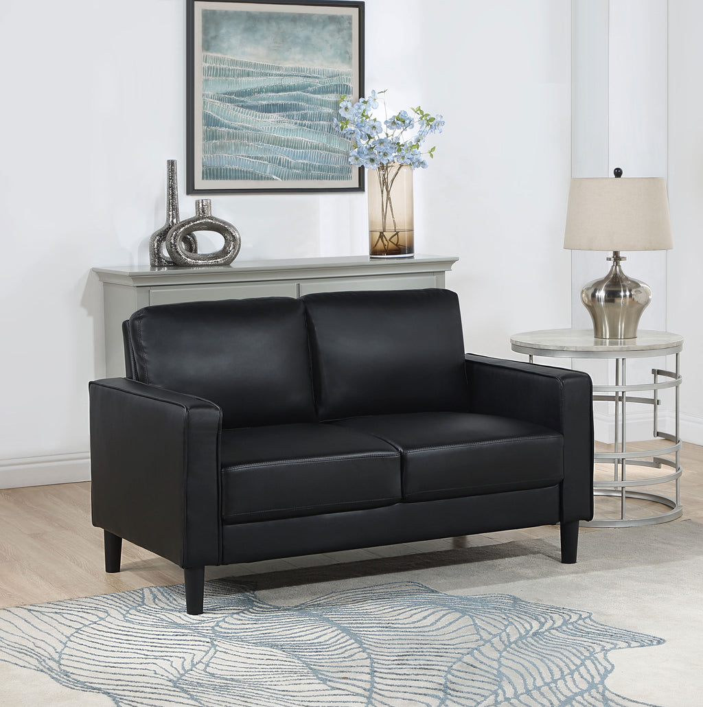 A compact profile makes this modern loveseat the perfect choice to add seating in a living room or den. It’s a structured silhouette complete with track arms. Faux leather upholstery is supple and smooth, offering contemporary style and sophistication that impresses without overwhelming. Plush cushions provide wonderful comfort for lounging, with sinuous spring decking under seats and a webbed back. Tapered, straight legs offer a chic finishing touch, providing support and stability.