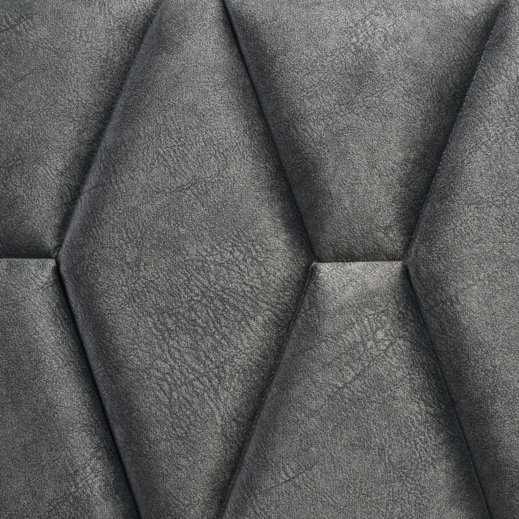Reimagine your bedroom retreat with the crisp, clean appeal of a modern four-piece bedroom set. Its clean, precise style is emphasized with sleek silhouettes and a bright white finish. The set centers on a chic bed with a tall headboard and low footboard, offering fresh style with geometric tufting in dark gray padded upholstery. Black finish legs complete the bed and bring cohesive style to the set, matching bases and hardware on the dresser and nightstand. The dresser offers plenty of storage and includes a framed mirror on top, adding bright reflectivity to your bedroom ensemble.