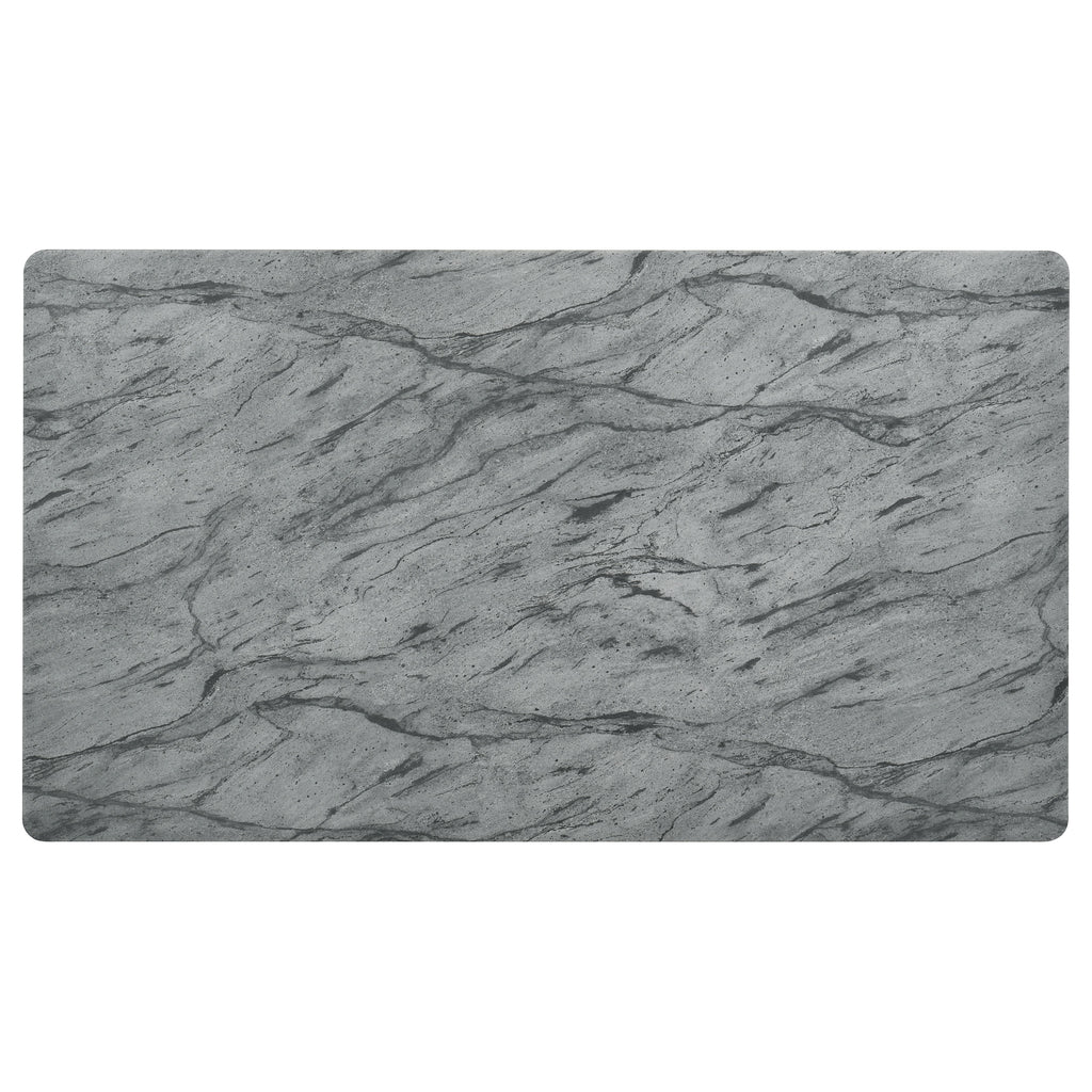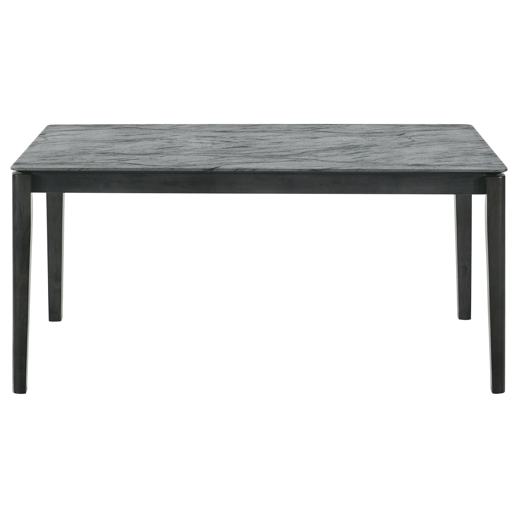 This mid-century modern five-piece dining set offers vintage vibes to any space. Designed with a softly beveled, faux marble top that seats up to six quite comfortably. Along with square shape tapered legs, the tabletop offers a minimal aesthetic to formal or casual gathering spaces. Each of the four chairs invite you to relax, designed with padded backrests and seats in a brown-toned grey fabric, along with a sturdy Asian tropical hardwood frame with straight front legs and flared back legs that extend up into jutted armrests. This five-piece dining table set makes a sleek addition to a space.