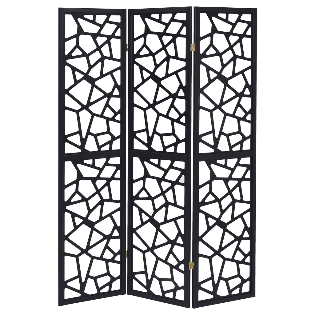 Make a bold statement in any space with this 3-panel room divider, featuring an eye-catching mosaic cutout pattern that enhances modern and mid-century décor. The sleek black finish creates a striking contrast, while the open geometric design allows light to pass through, maintaining an airy and spacious feel. Crafted with a durable solid wood frame, this partition is perfect for separating spaces, adding privacy, or serving as a decorative accent. Its folding trifold design offers versatility, making it easy to reposition as needed. Key Features: • Three-panel room divider with a bold open mosaic pattern for modern appeal • Sleek black finish enhances contemporary and mid-century décor • Trifold folding design allows for flexible room separation and styling • Crafted with durable engineered wood and FSC-certified pine for stability • Ideal for privacy, open-space definition, or as a stylish decorative accent • Light-filtering cutout pattern maintains an airy and open feel