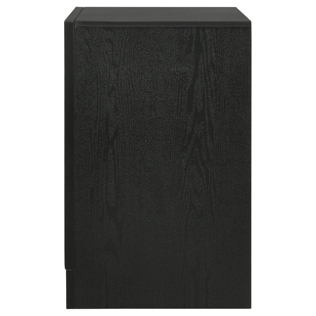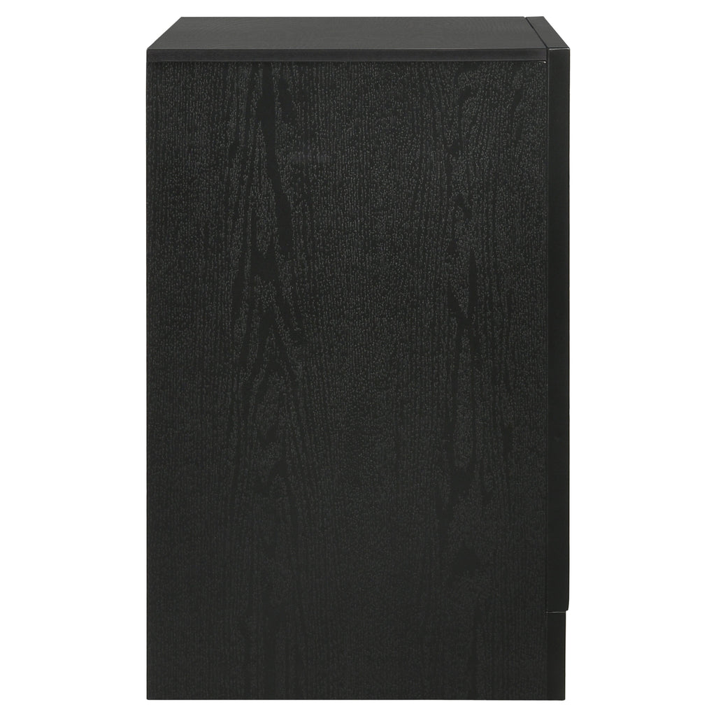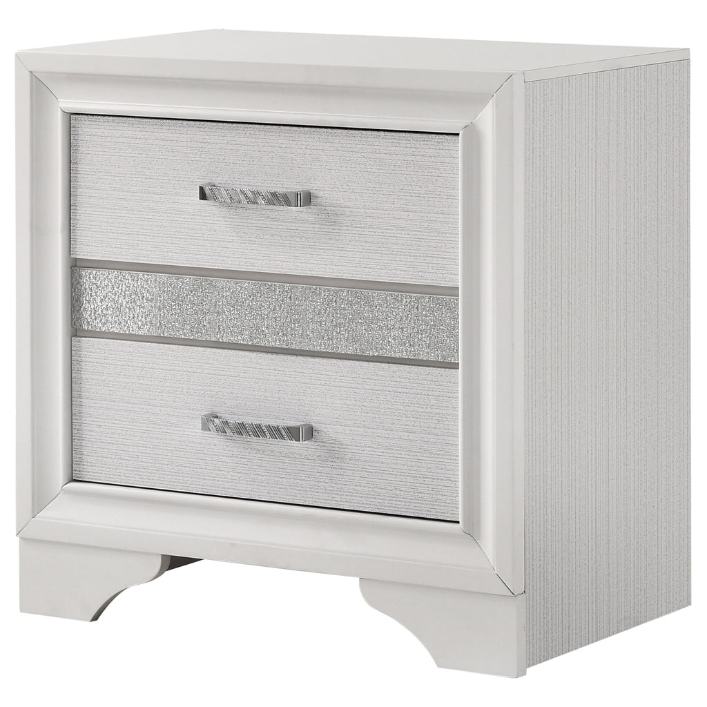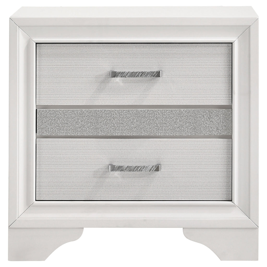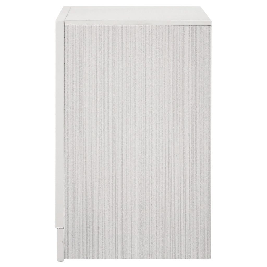 Infused with timeless glamour, this three-drawer nightstand brings refined character to any bedroom. Its linear profile is accented by elegant framing and a glittering center panel that conceals a hidden felt-lined drawer, ideal for delicate accessories. Smooth metal-extension glides ensure effortless drawer operation, while crystal-inspired pulls catch the light with radiant sparkle. Built from engineered wood and finished in a textured laminate veneer, it delivers durability with sophisticated transitional charm. Key Features: • Three-drawer nightstand with smooth full-extension glides • Hidden felt-lined drawer concealed behind glitter accent panel • Crystal drawer pulls enhance the glamorous design • Bright white finish with subtle textural detail on sides • Classic bracket base offers transitional styling • Crafted from engineered wood with laminate surfaces