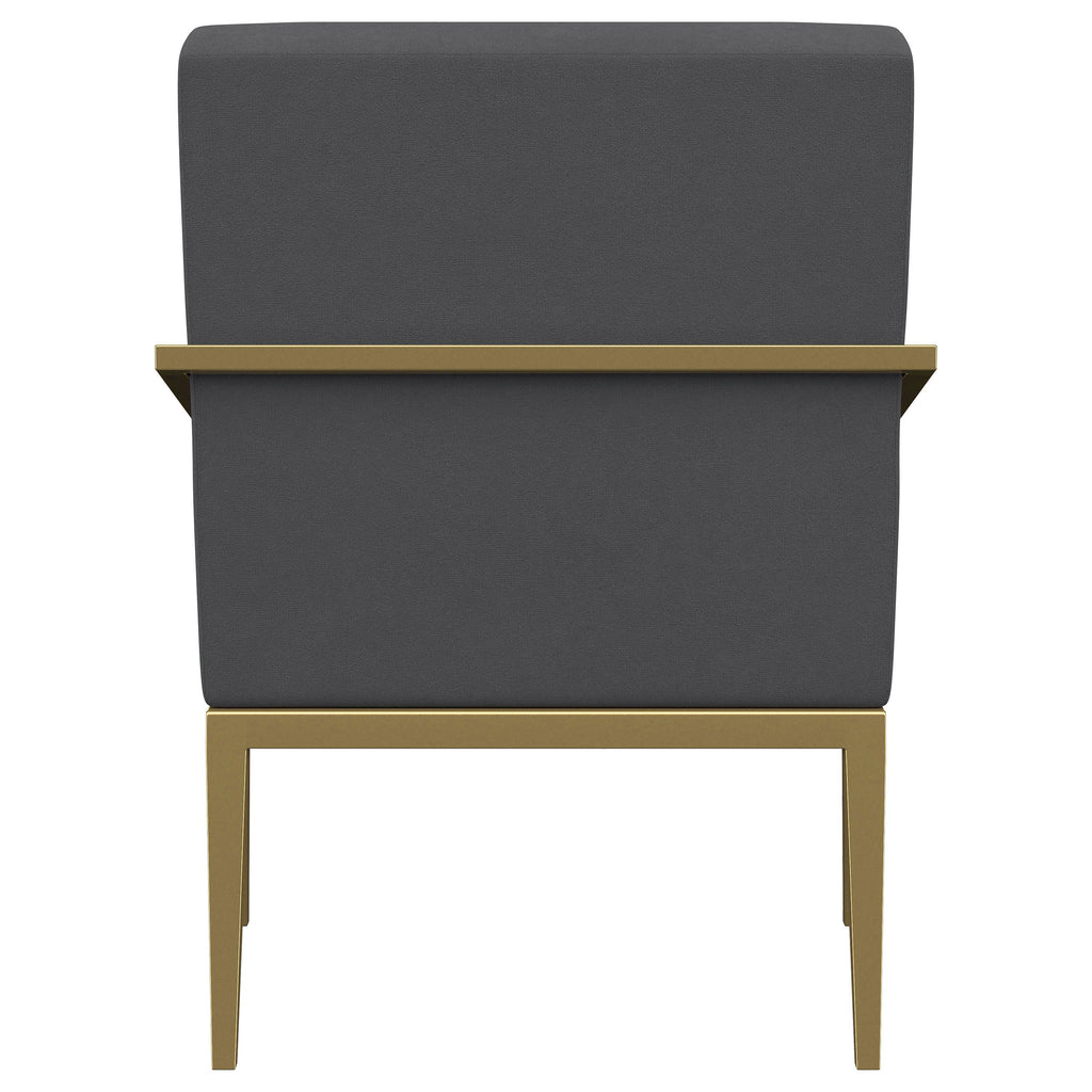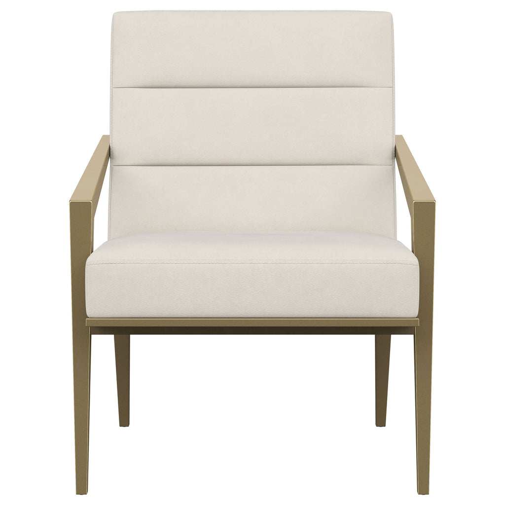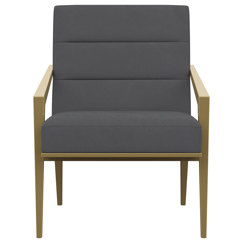 Restrained, modern style meets elegant artistry in a striking contemporary armchair. Designed to stand out, it boasts an upholstered seat and back with a metal frame and arms. The streamlined look receives a gleaming gold finish, adding sophistication anywhere from a sophisticated living room to a refined reception area in a professional space. Sloping, tapered arms define its silhouette, creating an accent chair that's sure to stand out. Channel tufting accents foam cushions, creating a sense of depth and dimension you'll appreciate in any setting.