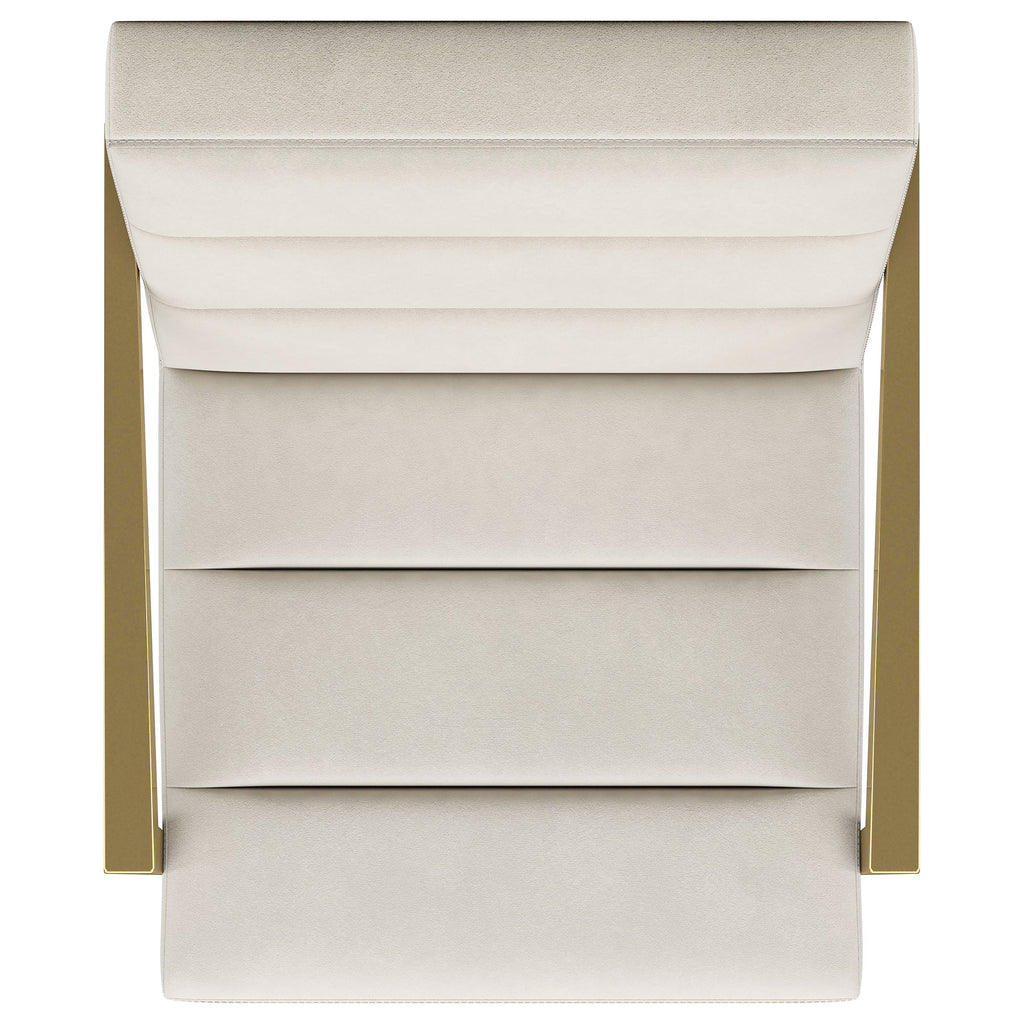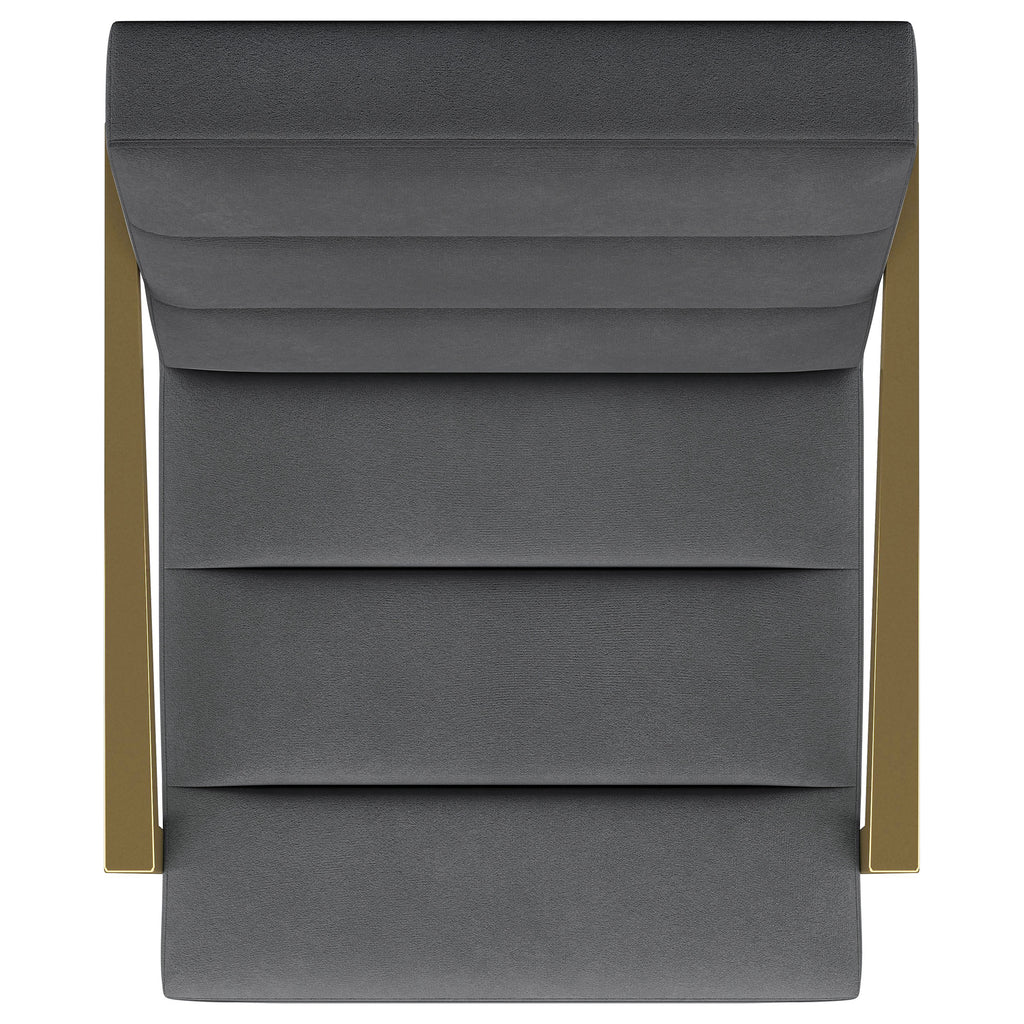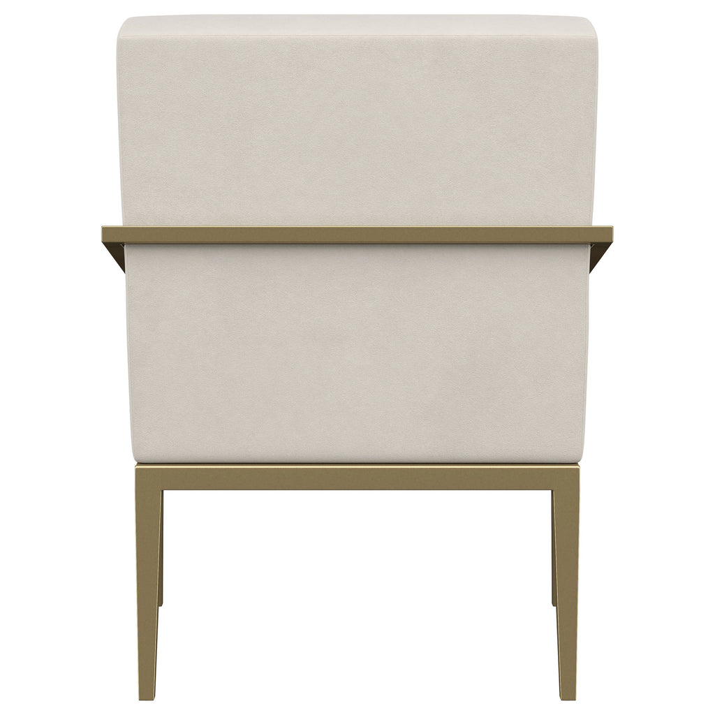 Restrained, modern style meets elegant artistry in a striking contemporary armchair. Designed to stand out, it boasts an upholstered seat and back with a metal frame and arms. The streamlined look receives a gleaming gold finish, adding sophistication anywhere from a sophisticated living room to a refined reception area in a professional space. Sloping, tapered arms define its silhouette, creating an accent chair that's sure to stand out. Channel tufting accents foam cushions, creating a sense of depth and dimension you'll appreciate in any setting.