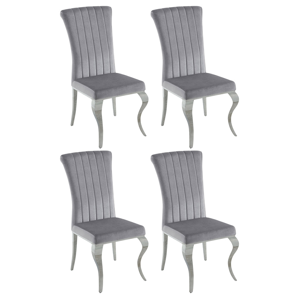This elegant side chair completes a room in sleek, sophisticated style. Its front legs boast a cool, quirky, curved design for an unexpected touch of creativity. All four legs are finished in chrome, adding a brilliant hint of shine. Its seat is upholstered in soft, luxe velvet, giving it an exquisitely appealing texture. This chair is available in multiple colors, giving you a variety of options to enhance your home. Key Features: • The look of elite luxury is yours with our stunning dining collection • Luxurious velvet and chrome are perfect for formal dining area or to dress up your everyday dining • Chair legs mimic the dramatically curved table legs, also in polished chrome • Sleek black or chic grey velvet upholstery lends plush softness to the roll back design of the side chairs • Stainless steel provides a sturdy frame for this glamorous dining collection