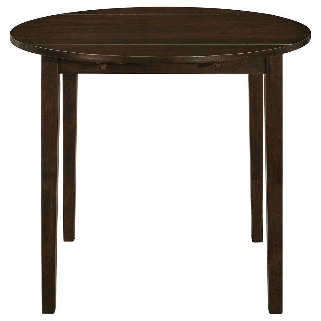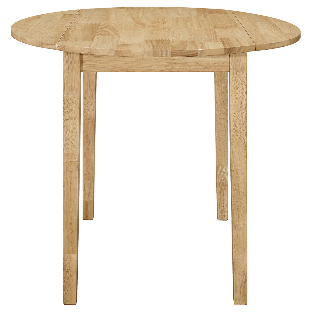 This lovely dining set lends an elegant touch of simple sophistication to a kitchen or breakfast nook. It comes complete with a lovely, round dining table and two comfy chairs upholstered in soft, light brown, padded fabric. The table is enhanced by a versatile drop-down extension which can be raised to accommodate an elaborate dining setup. Lowering it allows you to cozy up closely with a special someone over a leisurely breakfast or romantic, candlelit meal. A smooth, polished, natural wood finish gracefully complements the sleek, stylish silhouette of this beautiful three-piece set. Key Features: • Light and airy natural finish dining set is perfect for a casual breakfast nook • Round table with drop down leaves saves space • Chairs feature a contemporary rendition of a ladder back style • Padded seats in tan microfiber • Sold as a three piece all-inclusive set: Table plus two chairs