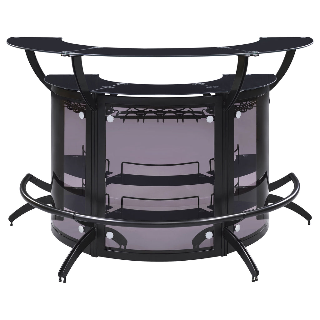 Presenting plenty of contemporary vibes, this home bar is sleek in every aspect. The black finish and acrylic construction give this piece an upscale look and feel. A rounded design offers storage space on multiple shelving units. Also included on this contemporary bar table are stemware racks to hold plenty of wine glasses. Whether you are entertaining a party of two or many, this contemporary bar table is the right choice for a stylish home.