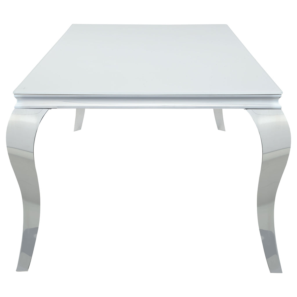 Glamorous with a luxurious touch, this elegant dining table makes the perfect addition to a formal dining space. With a mixed material design of durable stainless steel and glass, this dining table lends itself to several home decor styles. On each traditional Cabriole style leg is a gleaming chrome finish. Gather family and guests around the opaque tempered glass tabletop. In addition, this dining table seats six people comfortably. Key Features: • The look of elite luxury is yours with our stunning dining table crafted from stainless steel, the most durable metal to use for furniture, that will never rust • Luxurious glass and chrome are perfect for a formal dining area or to dress up your everyday dining • Polished chrome finish table base features dramatically curved Cabriole legs topped with white tempered glass • Curved table legs in polished chrome • Stainless steel provides a sturdy frame for this glamorous dining table