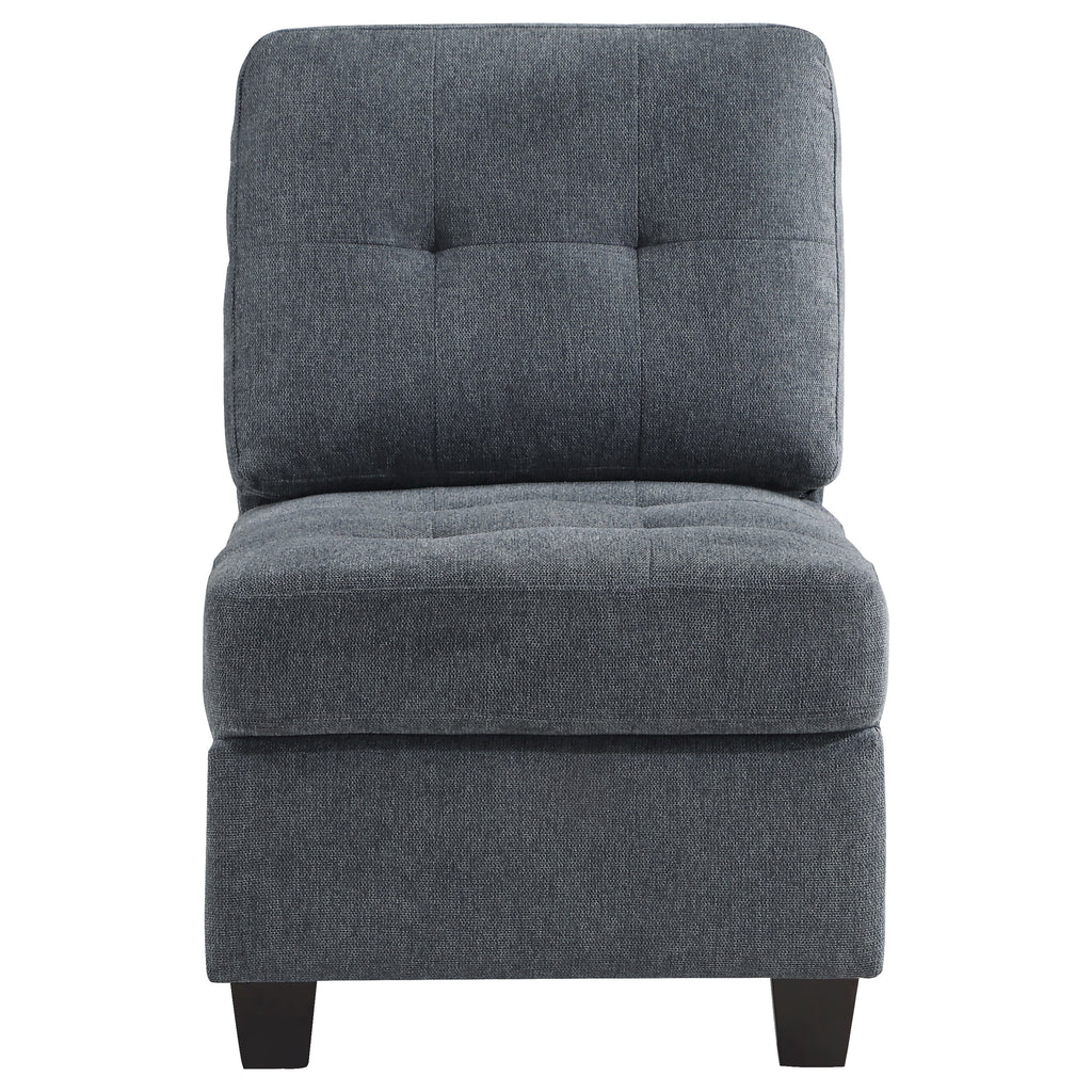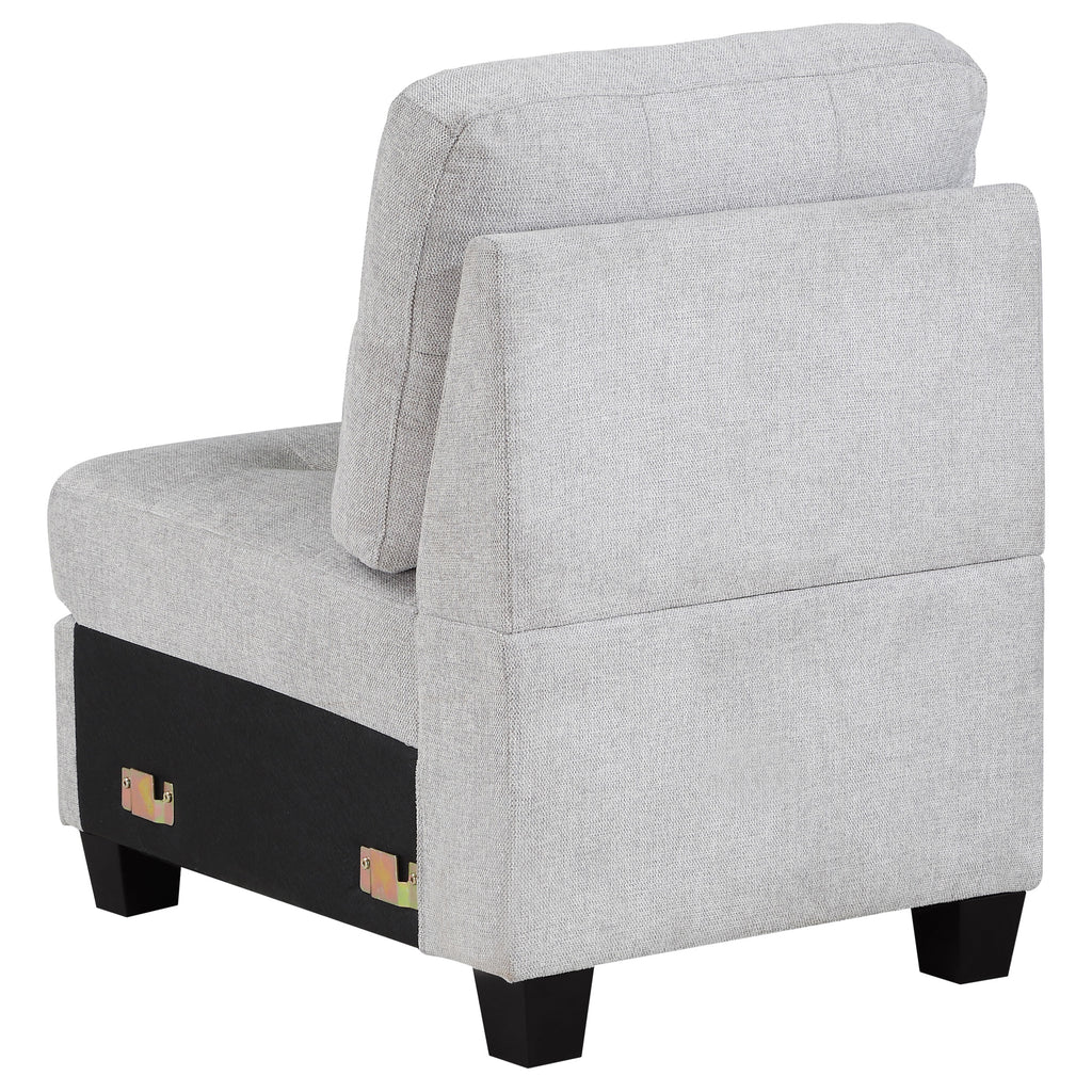 Elevate your living space with this versatile armless chair, perfect as a standalone piece or as an additional seating option in any room. Upholstered in a sophisticated fabric, this chair offers a timeless design that blends seamlessly with various decor styles. The chair features foam-padded seat cushions for superior comfort, supported by a sturdy wood frame that ensures long-lasting durability. Its sleek, armless design allows for flexible placement, making it ideal for smaller spaces or as an accent piece. The subtle tufting on the back cushion adds a touch of elegance, while chunky wood feet complete the classic look.