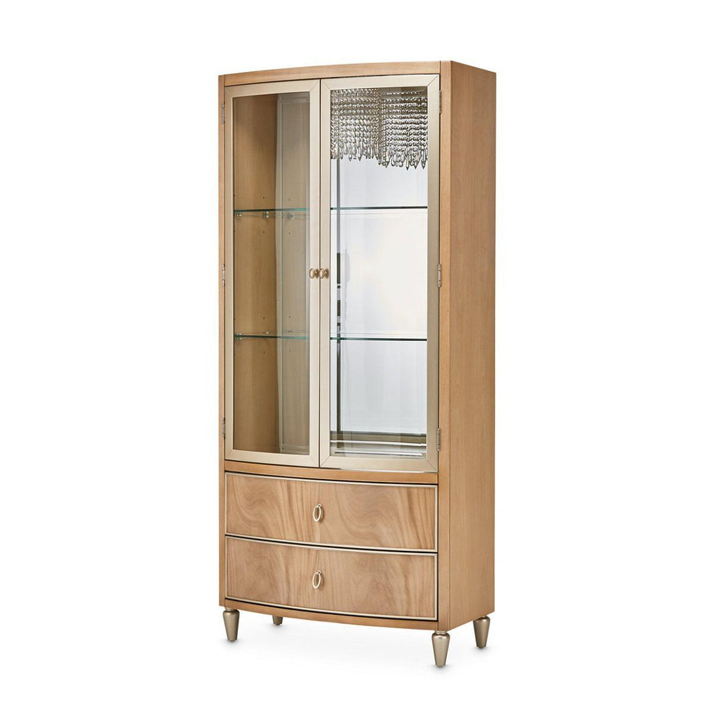 - Includes 3 glass shelves, a mini crystal chandelier and LED display light
