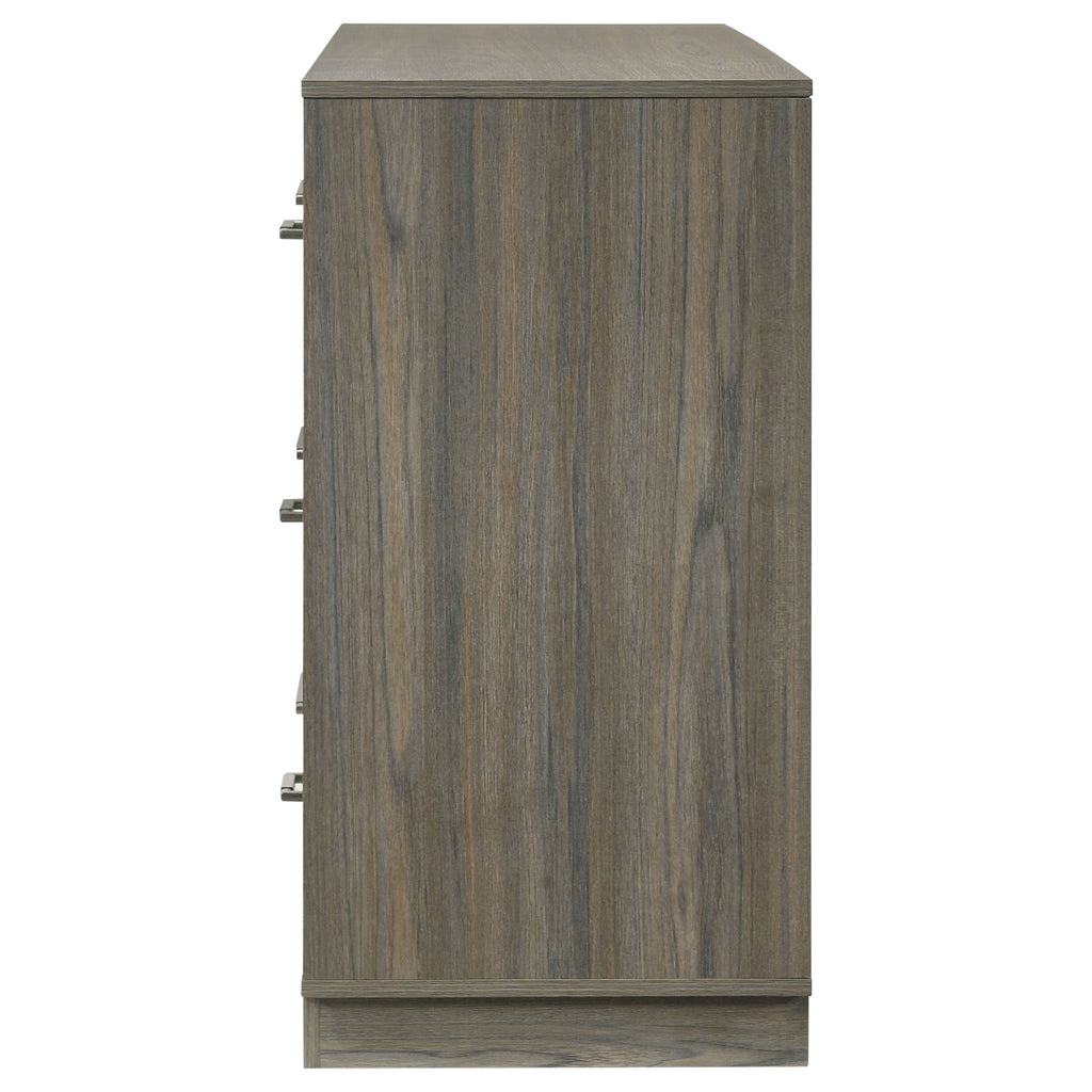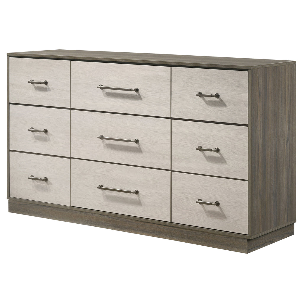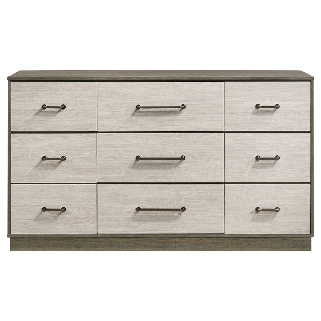 Introduce a blend of modern style and practical functionality to your bedroom with this sophisticated nine-drawer dresser. The contemporary two-tone melamine design offers a chic aesthetic, while the ample storage space ensures your belongings are neatly organized. Featuring a hidden jewelry drawer for added convenience, this dresser is as versatile as it is elegant. The antique nickel handles add a touch of vintage charm, and the floating base provides both stability and a sleek appearance. Crafted from durable melamine and engineered wood, this dresser is built to last, offering both beauty and functionality to your home.