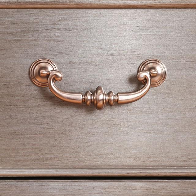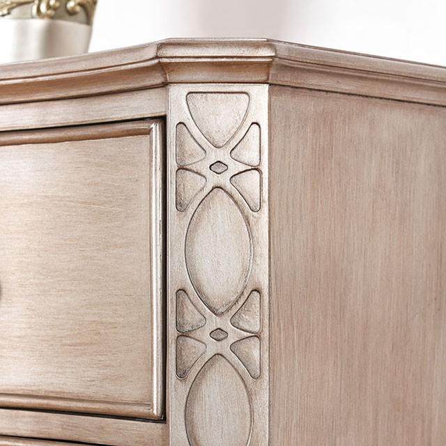 Feminine details and luxurious designs come together to form this elegant bedroom set. Featuring an extravagant gold finish to go with the padded and tufted headboard, this bed exudes royalty. Nailhead trim completes the regal appearance and a low footboard adds a touch of contemporary influence. Added utility with the power outlet hidden within the nightstand ensures this sophisticated set is not just easy on the eyes but also convenient and functional!