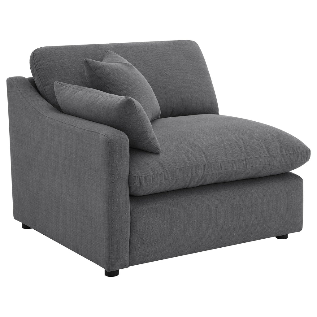 Complete your spacious modern living room with this beautifully designed six-piece modular sectional, featuring a soft and textural performance fabric. Feather blend-wrapped box cushion seating with reversible cushions and topstitched details, paired with a thin track arm design, create a sleek, modern aesthetic to elevate your family room and beyond. Matching accent pillows and plush back cushions, leaning back into sloped track armrests and backs. This sectional is perfect for accompanying your existing decor and welcoming fellow neutrals or adding a backdrop to vibrant colors.
